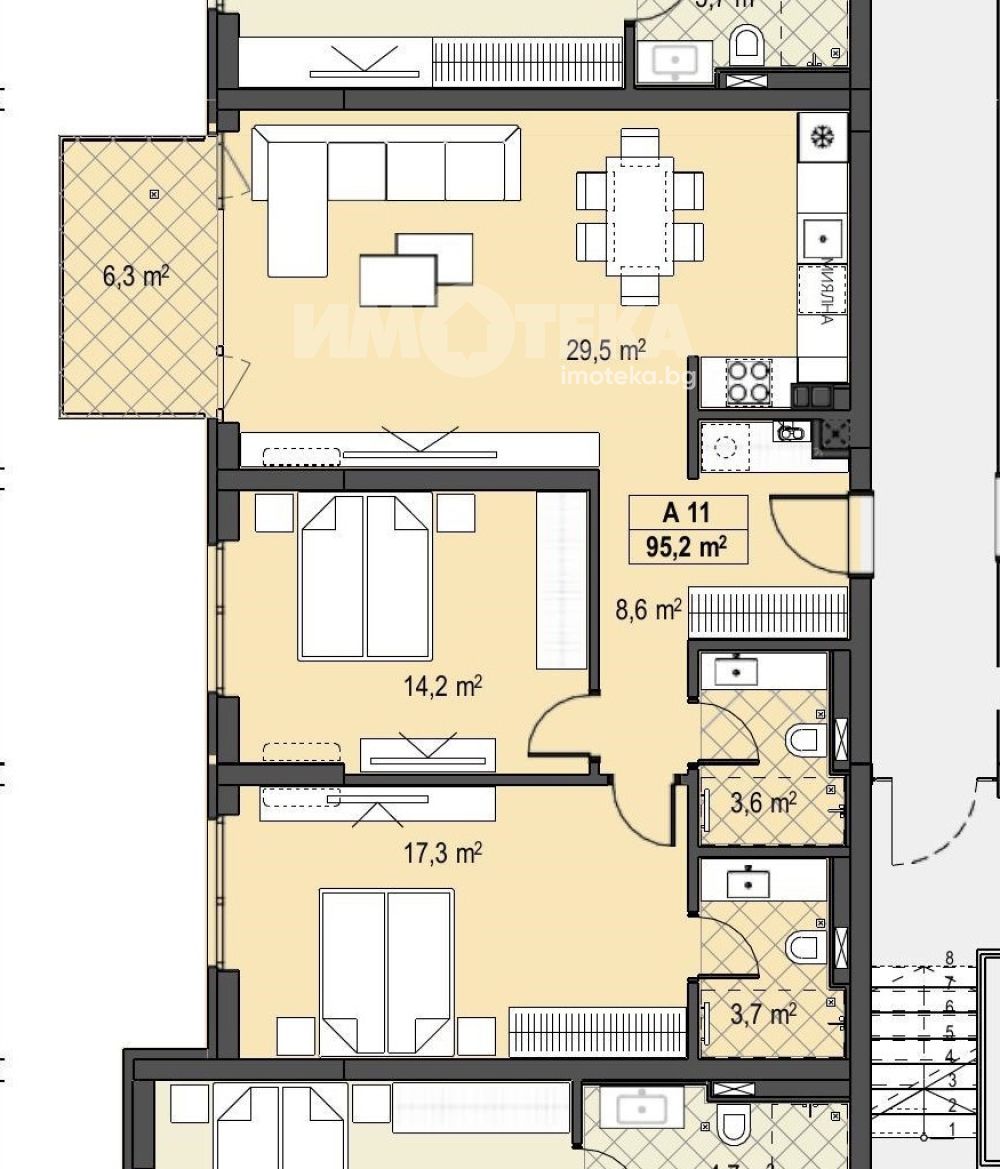 Тристаен апартамент със следното разпределение: дневна с кухненски бокс, две спални, две баня с wc, тераса. Схема на плащане 30% на 70%.