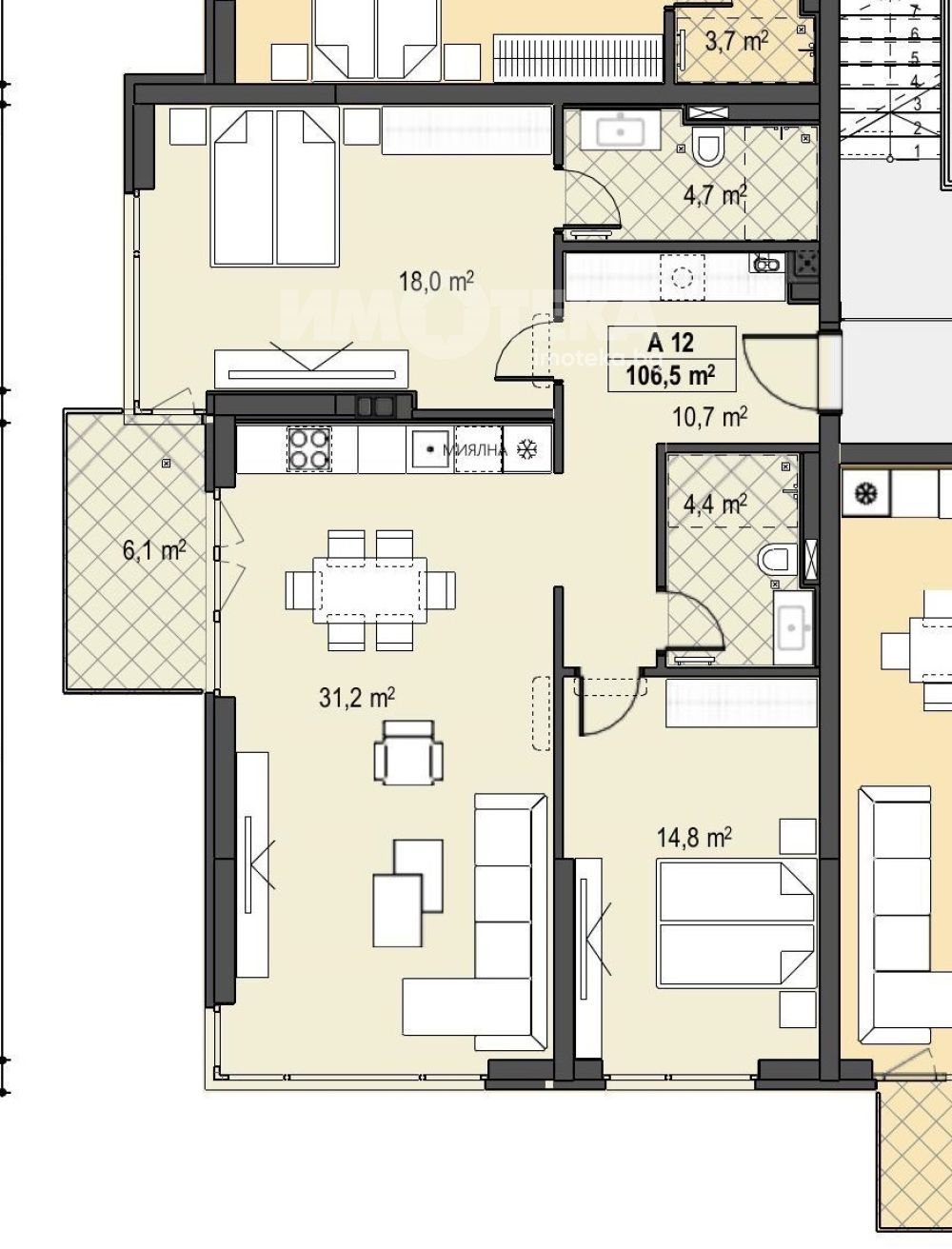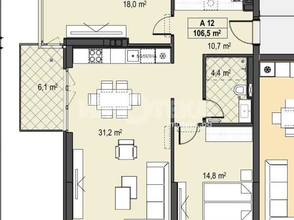 Тристаен апартамент със следното разпределение: дневна с кухненски бокс, две спални, две баня с wc, тераса. Схема на плащане 30% на 70%.