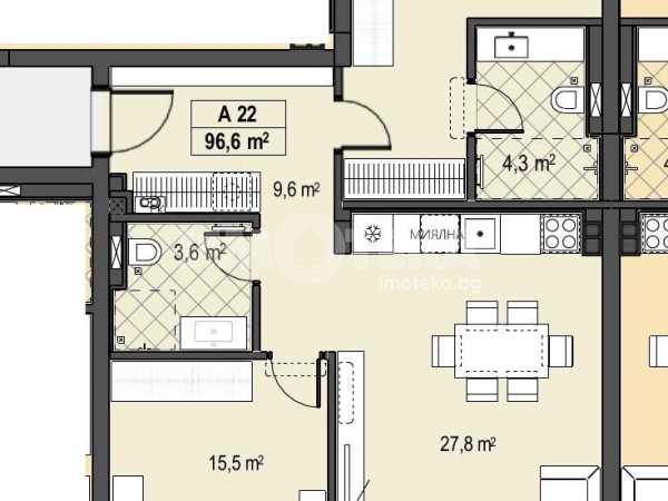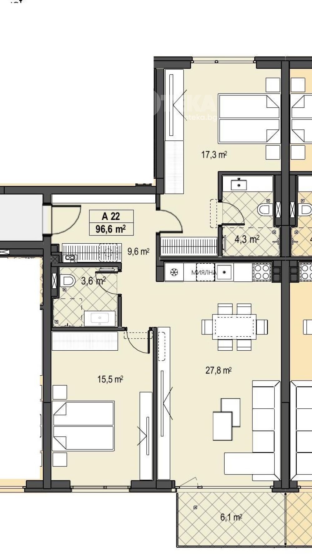 Тристаен апартамент със следното разпределение: дневна с кухненски бокс, две спални, две баня с wc, тераса. Схема на плащане 30% на 70%.