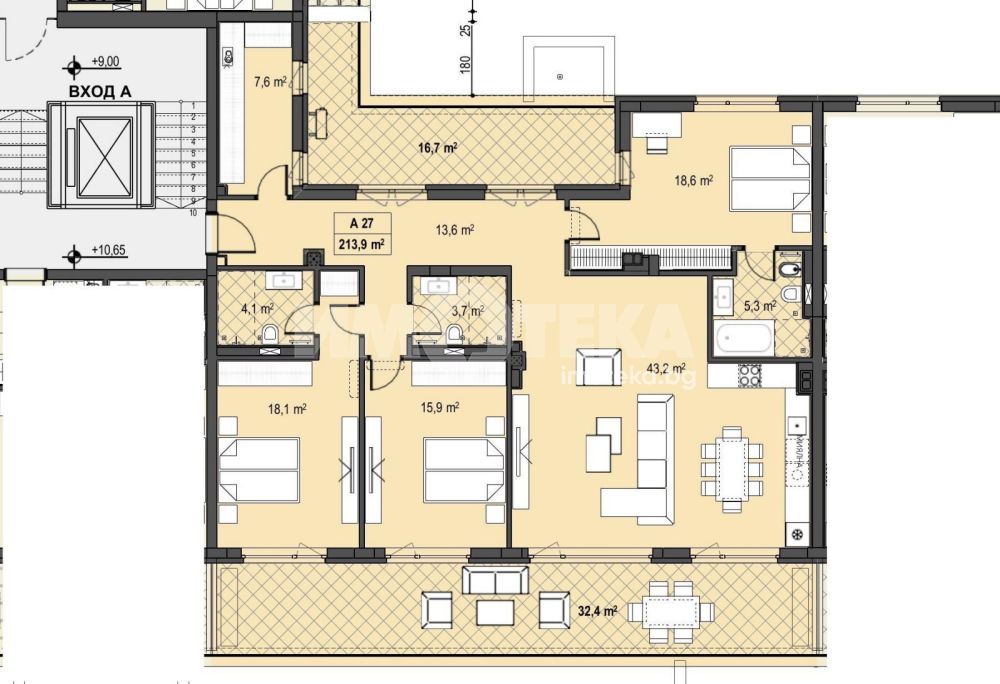 Тристаен апартамент със следното разпределение: дневна с кухненски бокс, две спални, две баня с wc, с две собствени панорамни тераси. Схема на плащане 30% на 70%.