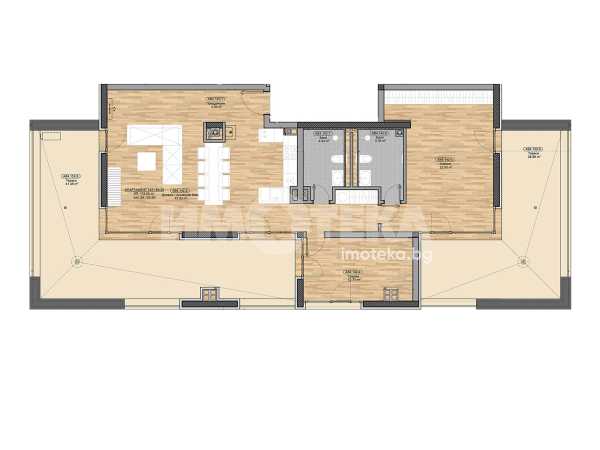 Разполага с всекидневна с кухненски бокс, две спални, гардеробна, две бани с тоалетни и две тераси.
