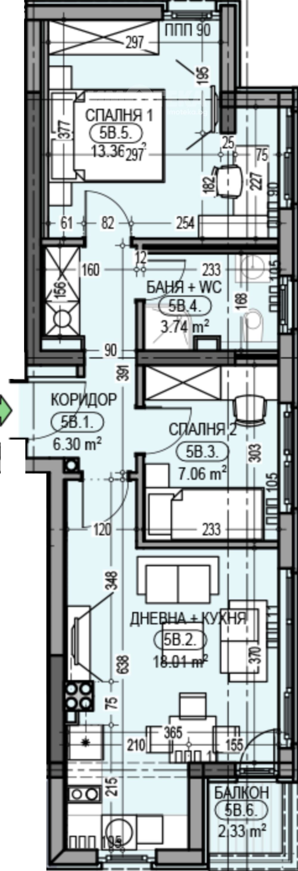 Тристаен апартамент със ЗП-64.80 м2, РЗП-76.57 м2 и следното разпределение:коридор, дневна с кухненски бокс и трапезария, две спални, баня с тоалетна и тераса. Изложението е юг-северозапад.