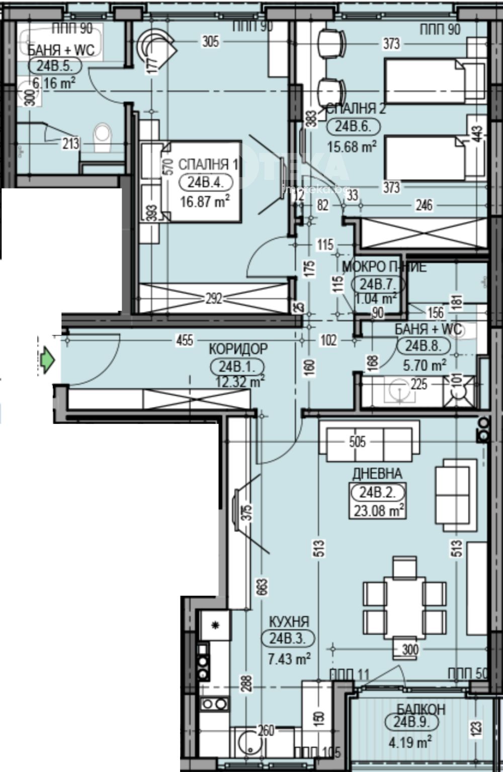 Тристаен апартамент със ЗП-107.02 м2, РЗП-126.46 м2 и следното разпределение: коридор, дневна с кухненски бокс и трапезария, две спални, две бани с тоалетни, килер/мокро и тераса. Изложението е юг-северозапад.