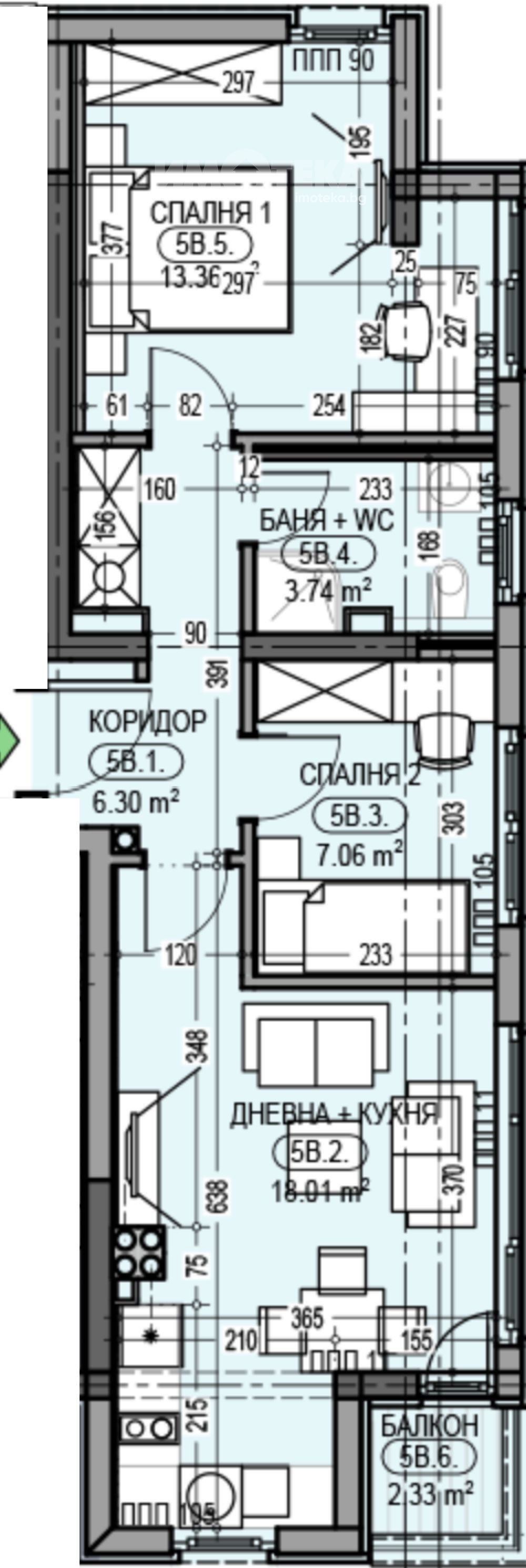Тристаен апартамент със ЗП-64.80м2, РЗП-76.57м2 и следното разпределение: коридор, дневна с кухненски бокс и трапезария, две спални, баня с тоалетна и тераса. Изложението е юг-северозапад.