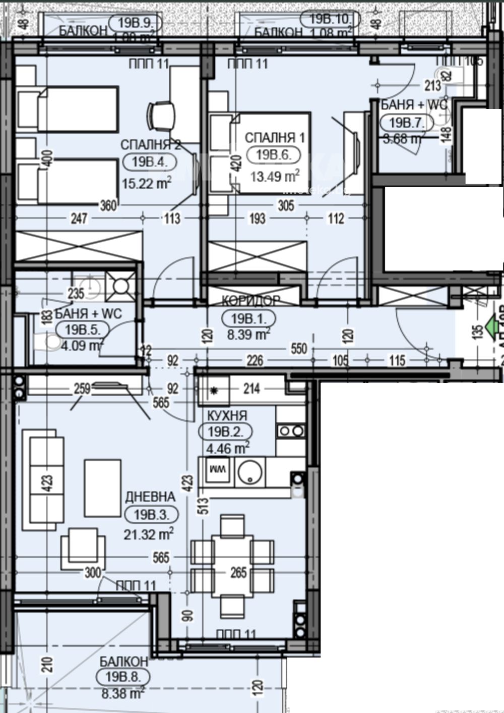 Тристаен апартамент със ЗП-97.54 м2, РЗП-115.25 м2 и следното разпределение: коридор, дневна с кухненски бокс и трапезария, две спални, две бани с тоалетни и три тераса. Изложението е юг-северозапад.