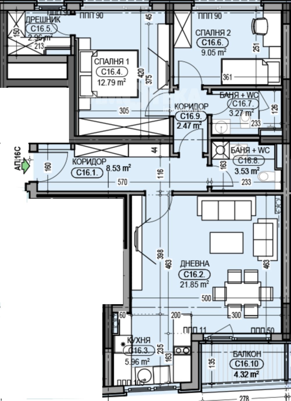 Тристаен апартамент със ЗП-90.79м2, РЗП-107.28м2 и следното разпределение: коридор, дневна с кухненски бокс и трапезария, две спални, две бани с тоалетни и тераса. Изложението е юг-северозапад.