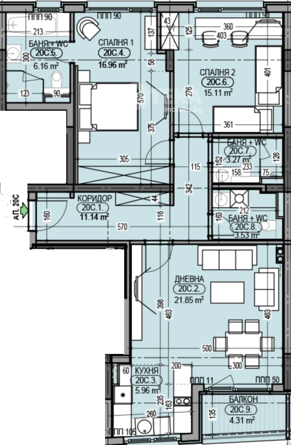 Тристаен апартамент със ЗП-107.02 м2, РЗП-126.46 м2 и следното разпределение: коридор, дневна с кухненски бокс и трапезария, две спални, три бани с тоалетни и тераса. Изложението е юг-северозапад.
