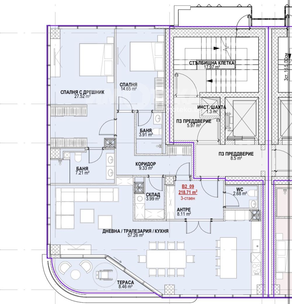 Апартамента се състои от голяма дневна с кухненски бокс 57.кв.м, спалня с дрешник и собствена баня с тоалетна, втора спалня, втора баня с тоалетна, тоалетна, мокро помещение и тераса.