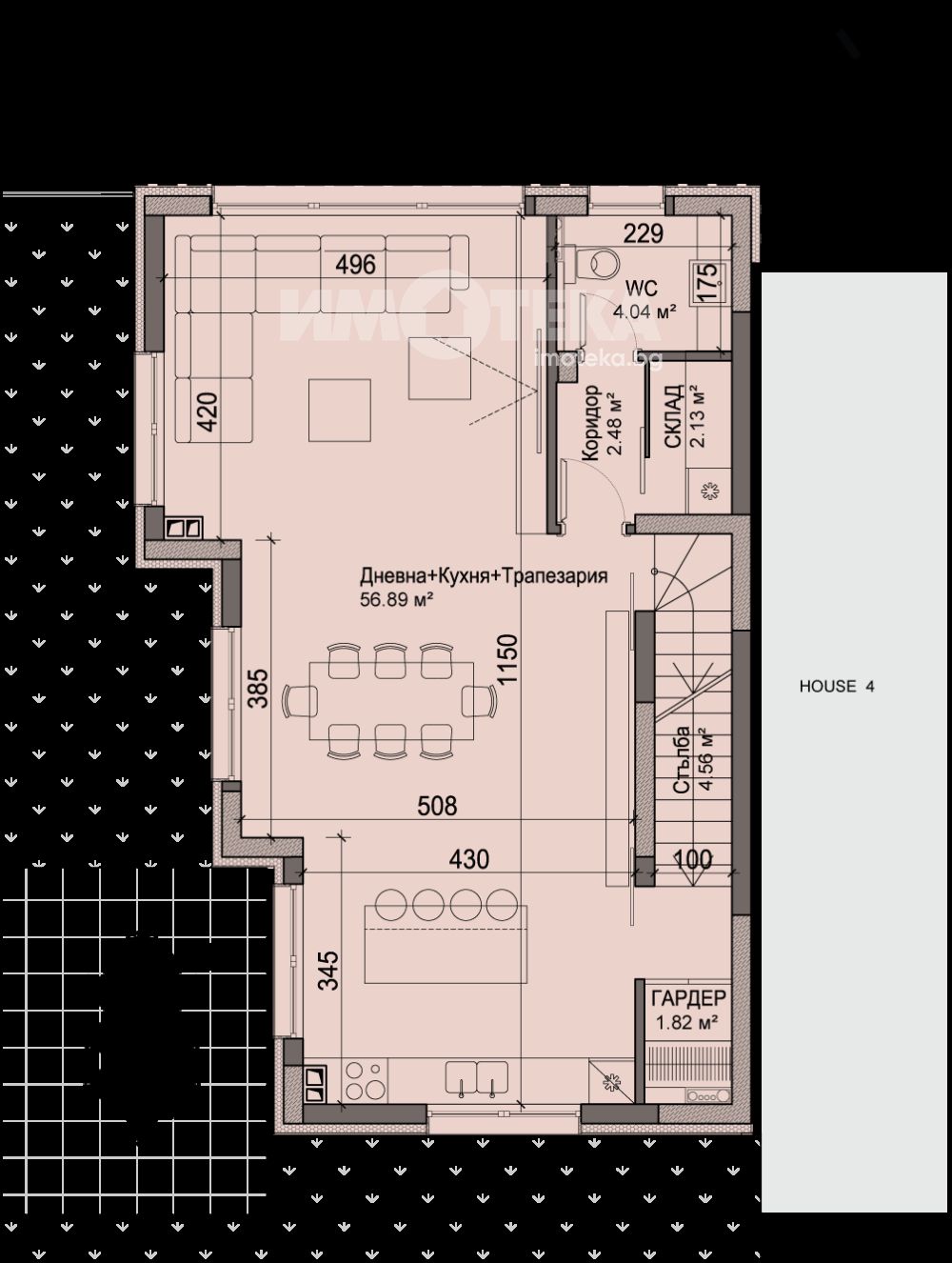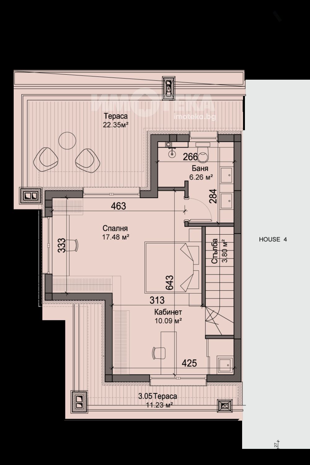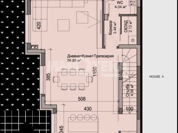 Еднофамилна къща в затворен комплекс с практичен и модерен дизайн. Къщата разполага с дневна с трапезария и кухня; 3 спални и работен кабинет и/или гардеробно помещение и Южна тераса насочена към планината и тераса с гледки към града. Към нея са предвидени паркоместа обособени в собствен подземен гараж. Къщата разполага със собствен двор с площ от 189м2.