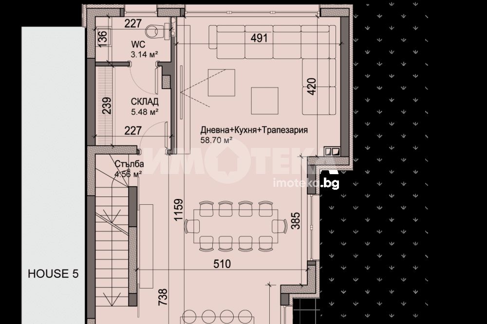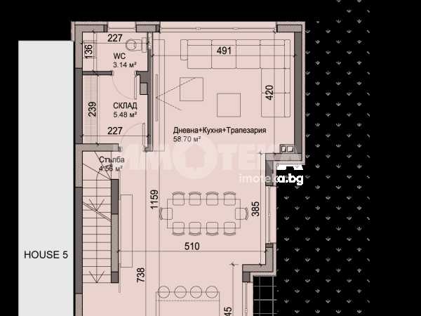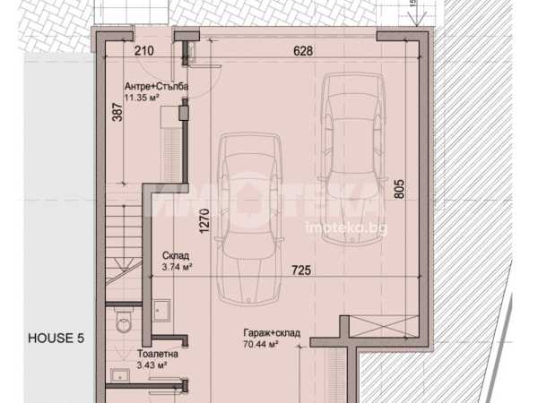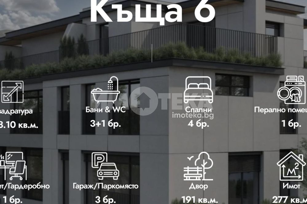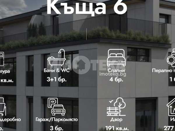 Редова къща №6 с РЗП-368 кв.м. на 4 етажа, в комплекс от общо 6 къщи в един парцел-2137кв.м., разпределена по следния начин; сутерен-гараж, склад, приземен етаж- дневна, кухня,трапезария, склад, тоалетна, първи етаж-три спални, две бани/тоалетни, мокро помещение, втори етаж-спалня, баня/тоалетна, кабинет, две тераси.