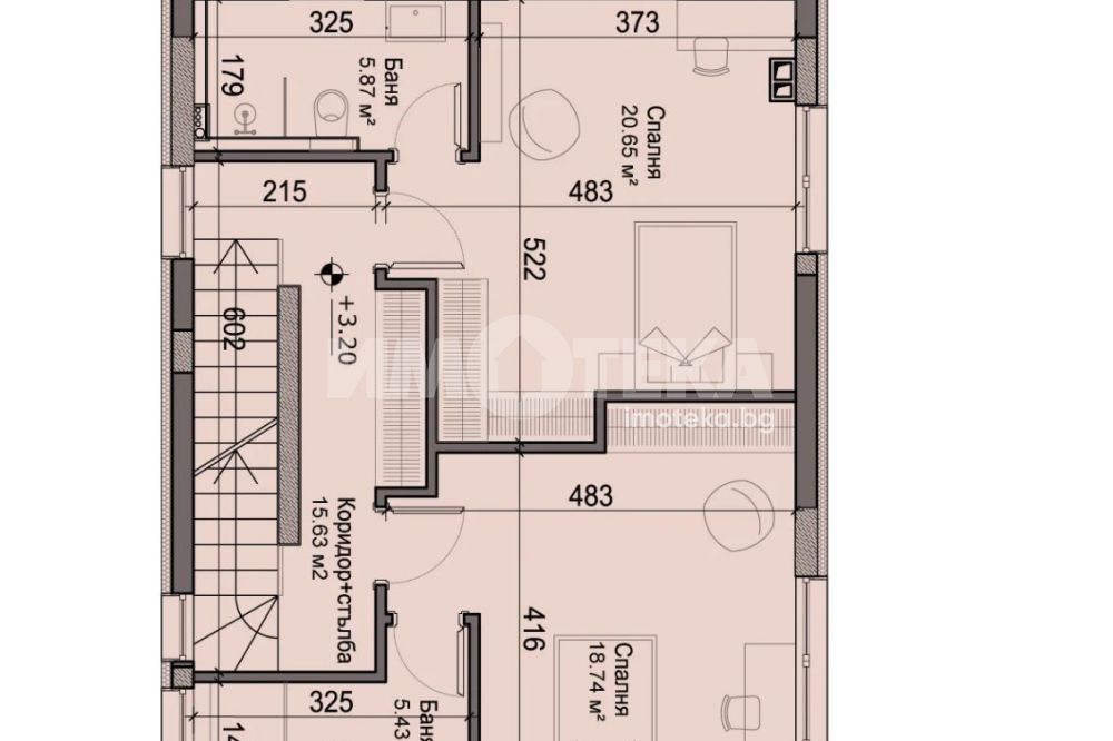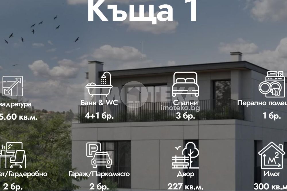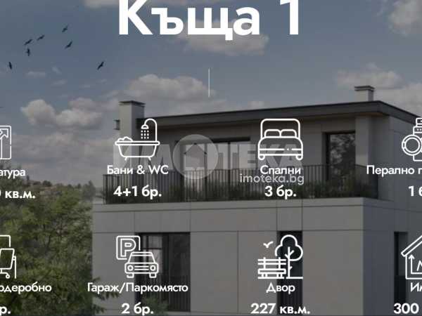 Редова къща №3 с РЗП-346 кв.м. на 4 етажа, в комплекс от общо 6 къщи в един парцел-2137кв.м., разпределена по следния начин; сутерен-кабинет, баня/тоалетна, техническо помещение, приземен етаж-дневна, кухня,трапезария, склад, тоалетна, първи етаж-две спални, две бани/тоалетни, втори етаж-спалня с голяма тераса, баня/тоалетна, дрешник.