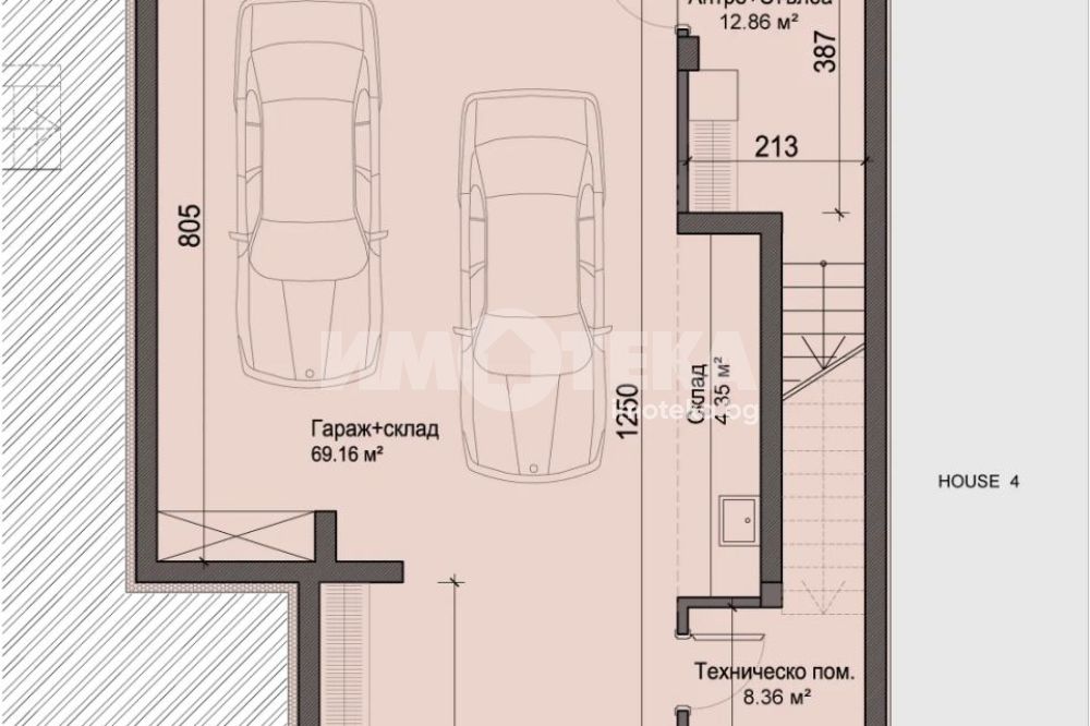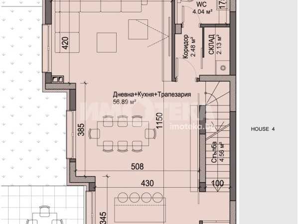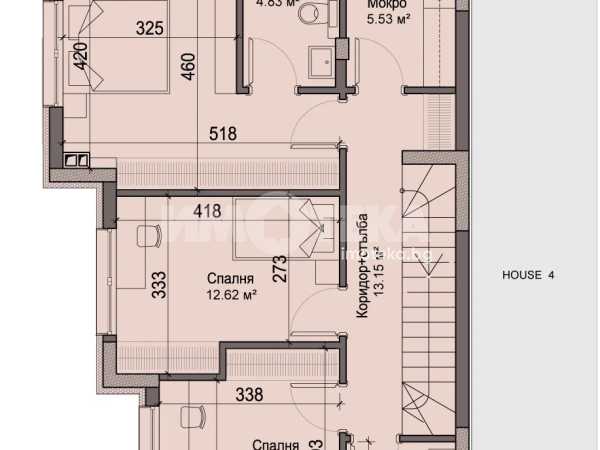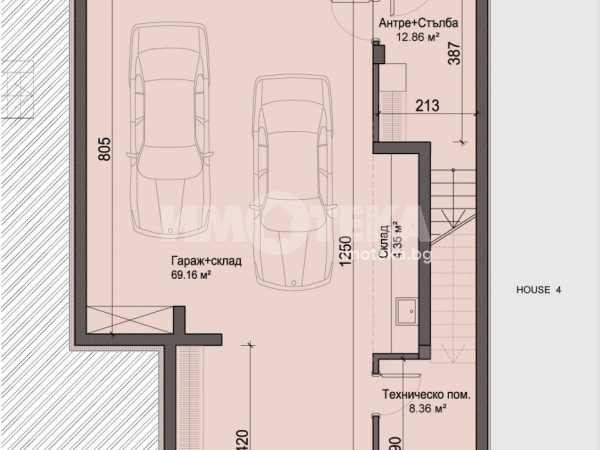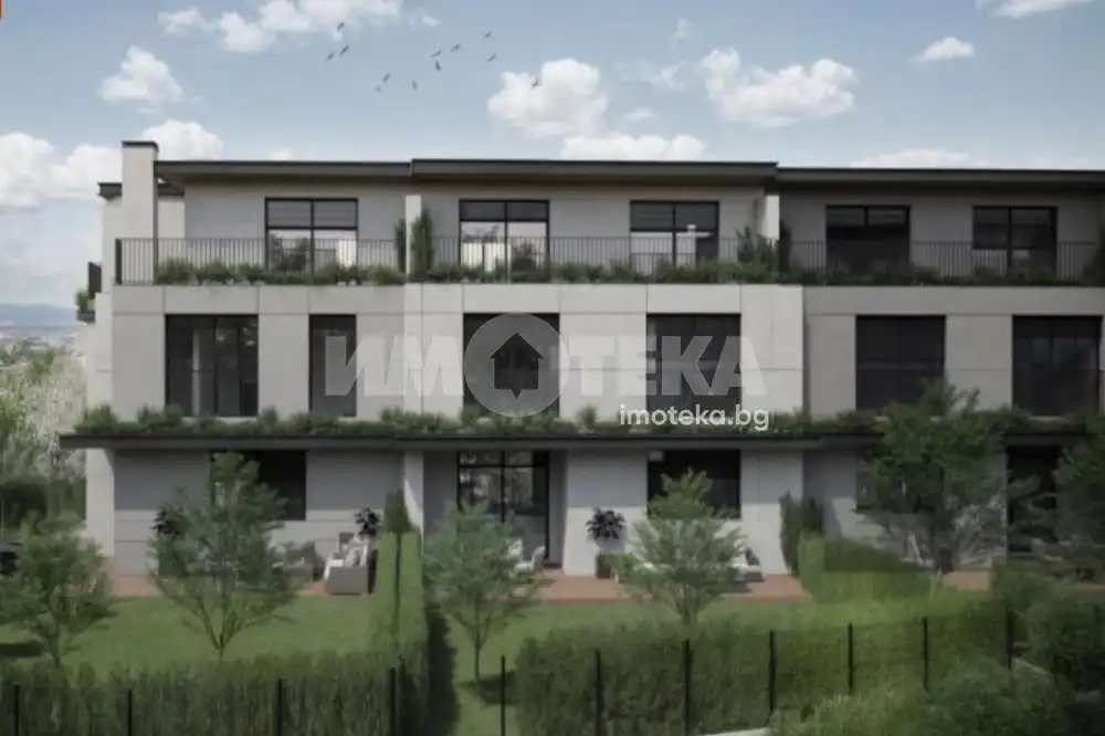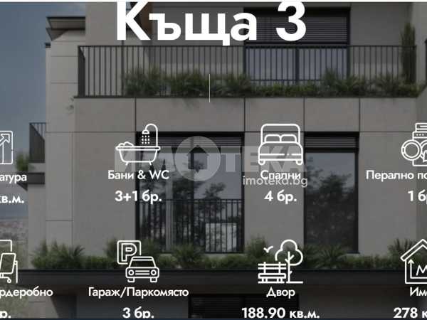 Редова къща №3 с РЗП-371 кв.м. на 4 етажа, в комплекс от общо 6 къщи в един парцел-2137кв.м., разпределена по следния начин; сутерен-гараж, приземен етаж-дневна, кухня,трапезария, склад, тоалетна, първи етаж-три спални, две бани/тоалетни, мокро помещение, втори етаж-спалня, баня/тоалетна, две тераси.