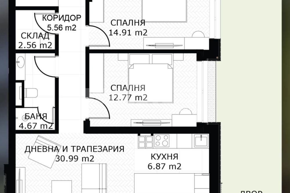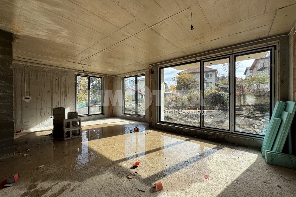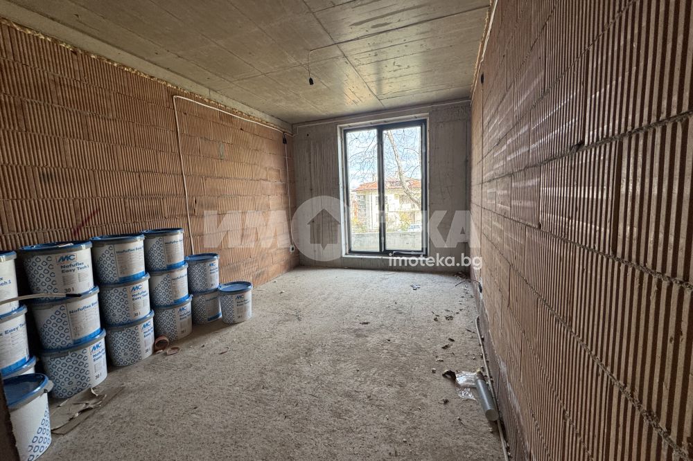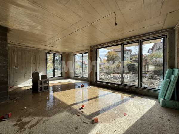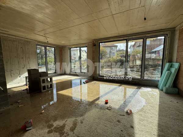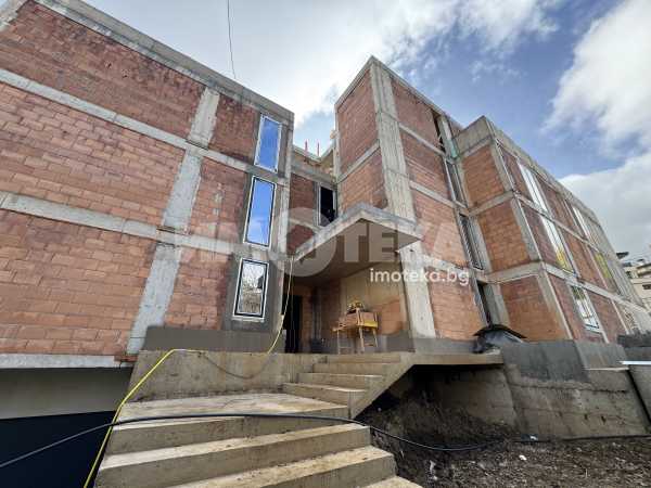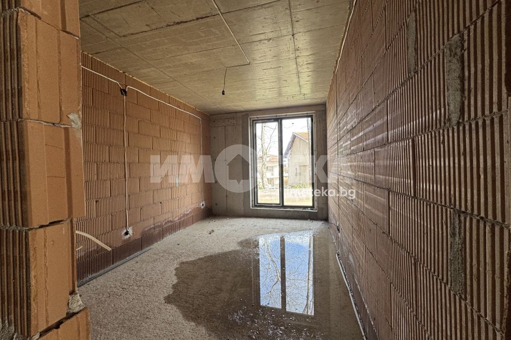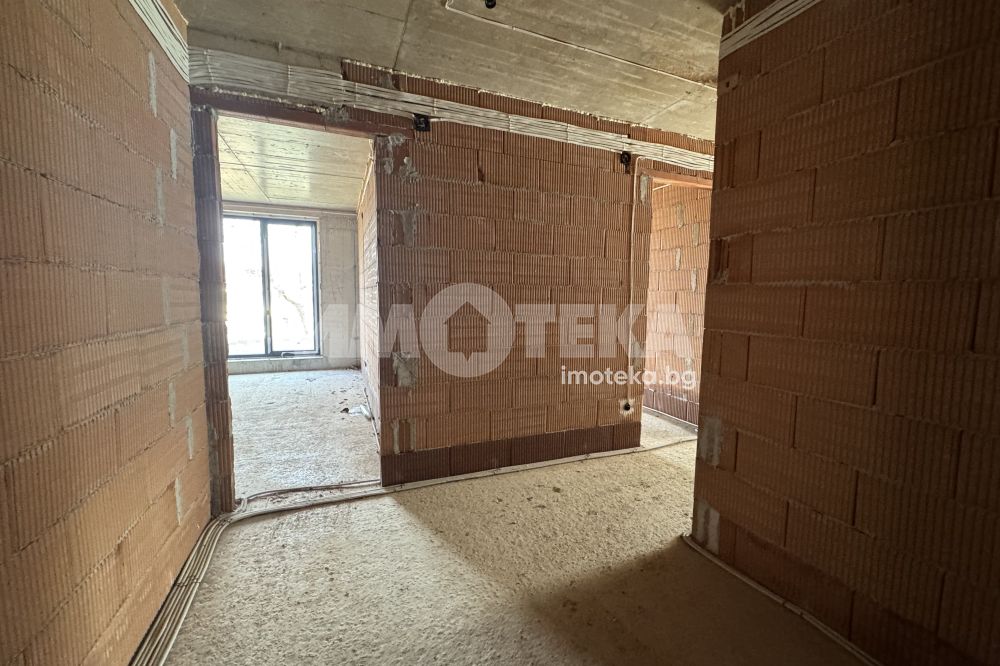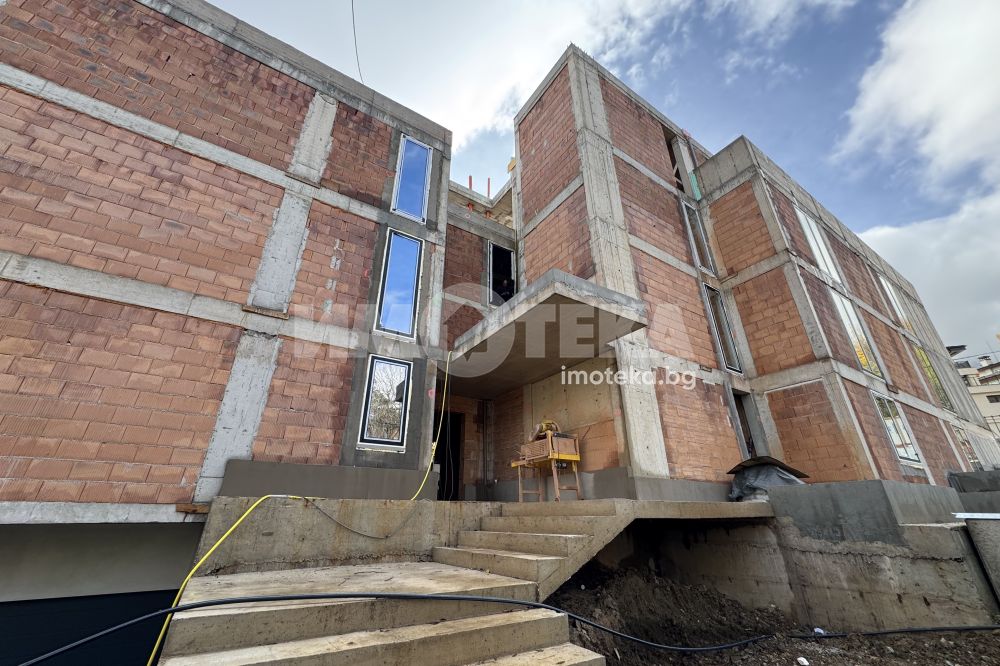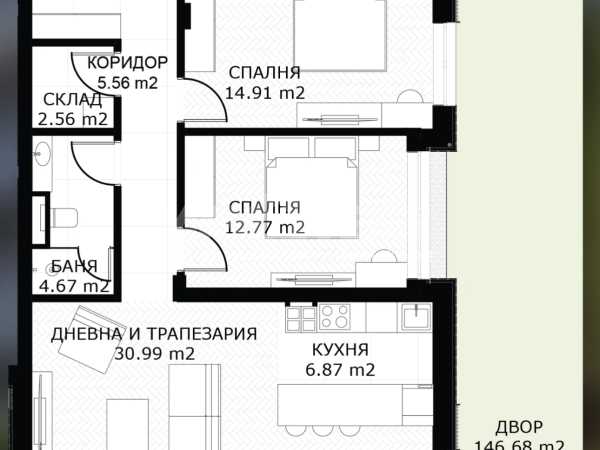 Четиристаен апартамент със самостоятелен двор, състоящ се от входно антре, дневна зона с кухненски бокс, три спални, две бани с WC.