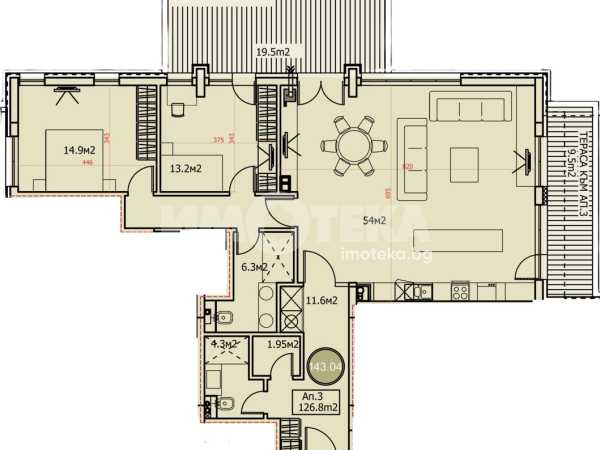 АПАРТАМЕНТ 03 е разположен на първи - партерен етаж, със застроена площ от 126.80 кв.м. жилищна площ, отделно 29.00 кв.м. дворна тераса.