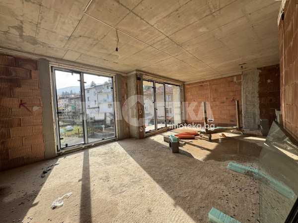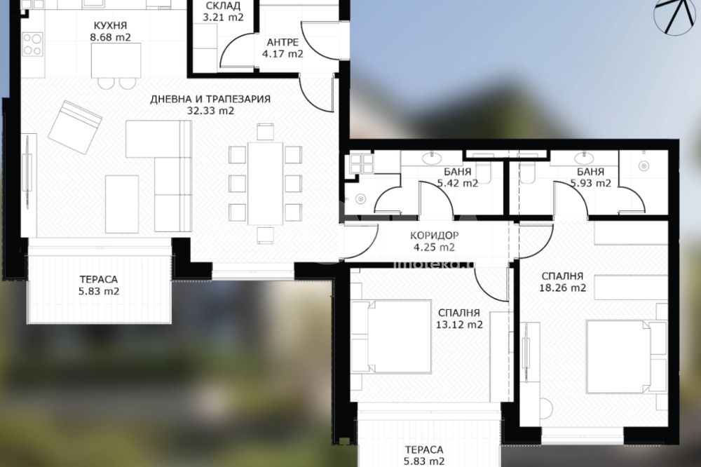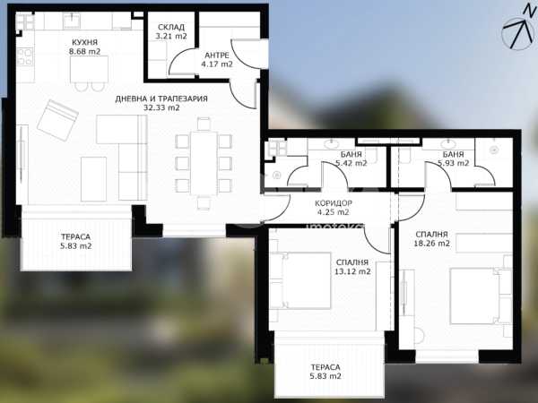 Тристаен апартамент, състоящ се от входно антре, склад, дневна зона и кухненски бокс, две бани с WC, две спални и две тераси.