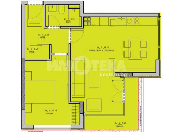 Просторен двустаен апартамент с РЗП: 88,96 кв.м. и ЗП: 75,76 кв.м.. Югоизточно изложение.