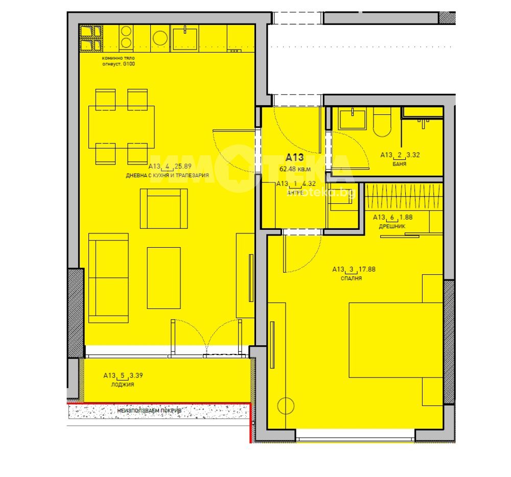 Просторен двустаен апартамент с РЗП: 75,74 кв.м. и ЗП: 64,50 кв.м.. Югоизточно изложение.