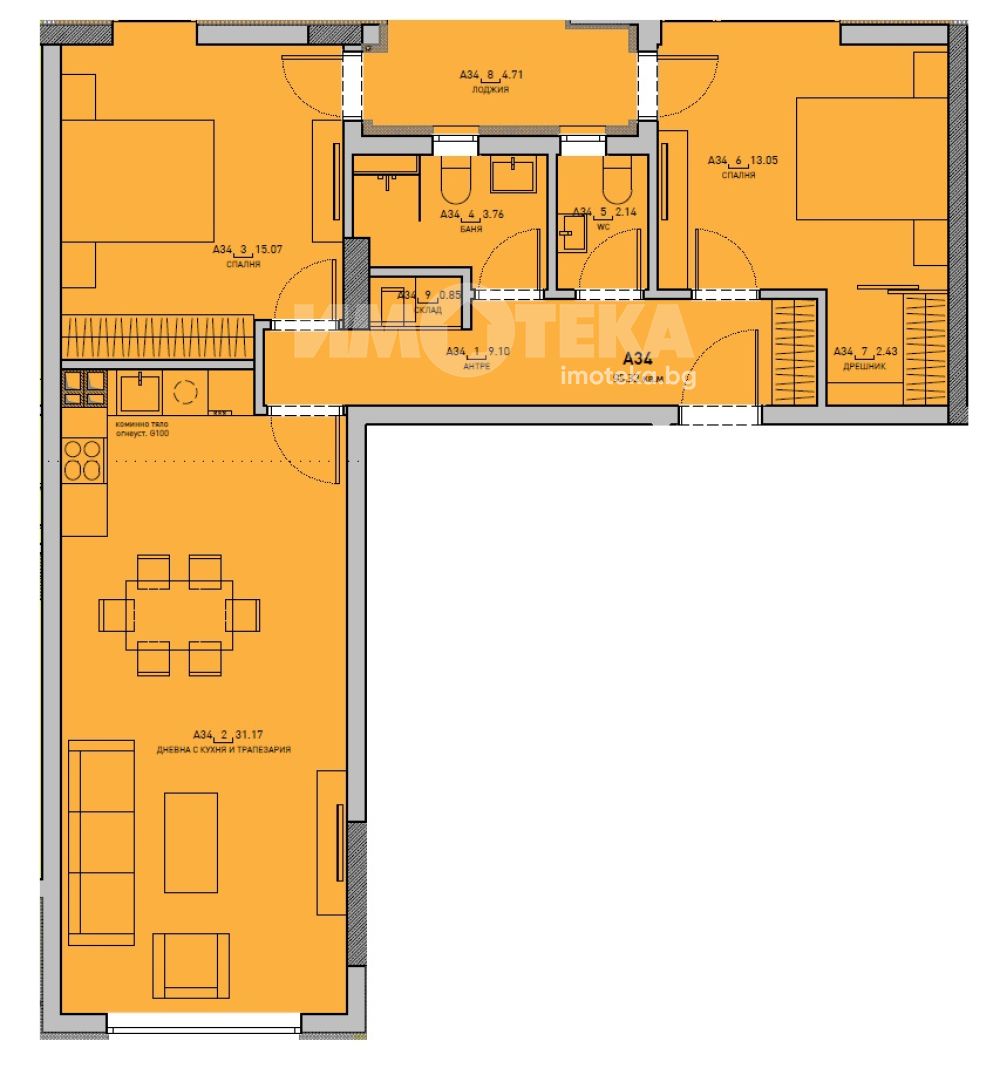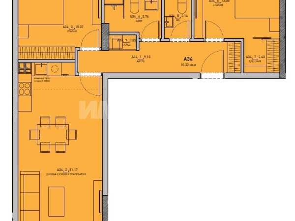 Просторен тристаен апартамент с РЗП: 112,29 кв.м. и ЗП: 97,17 кв.м.. Югоизточно изложение.