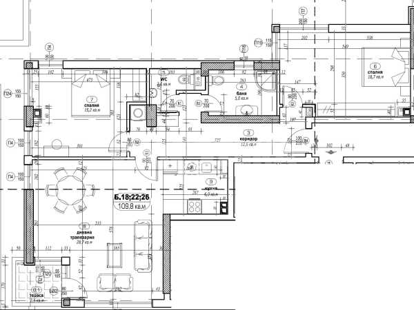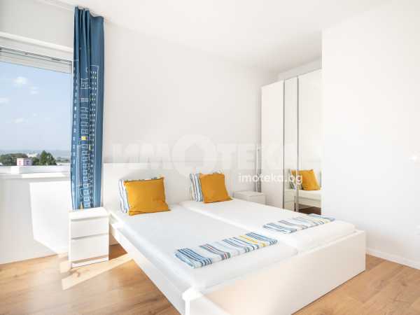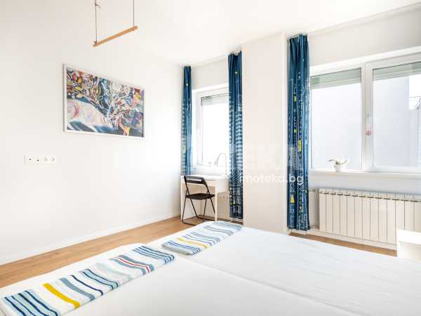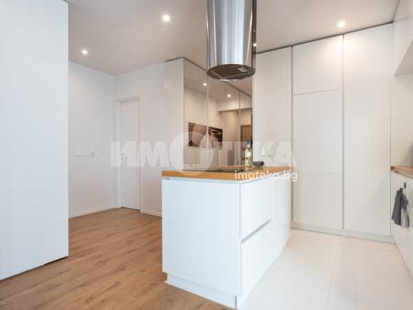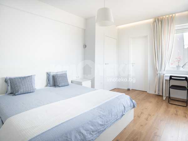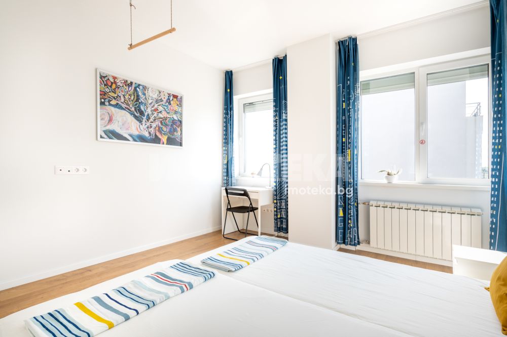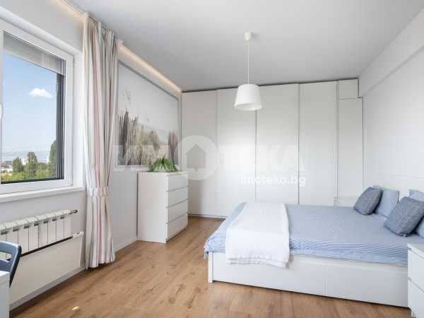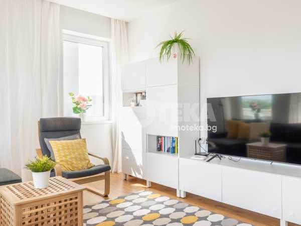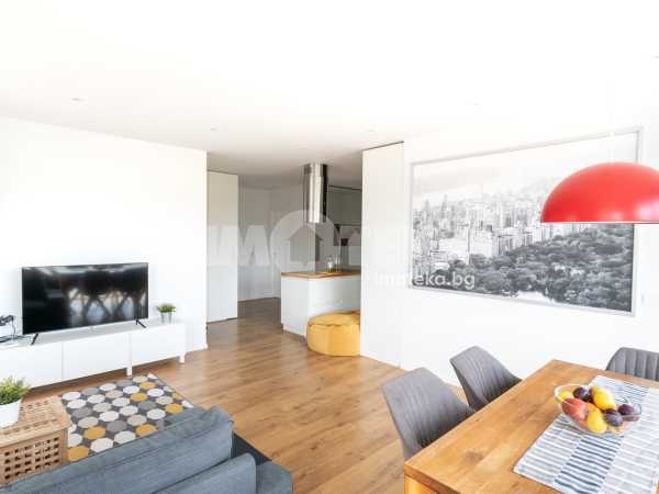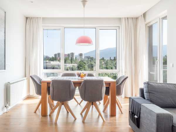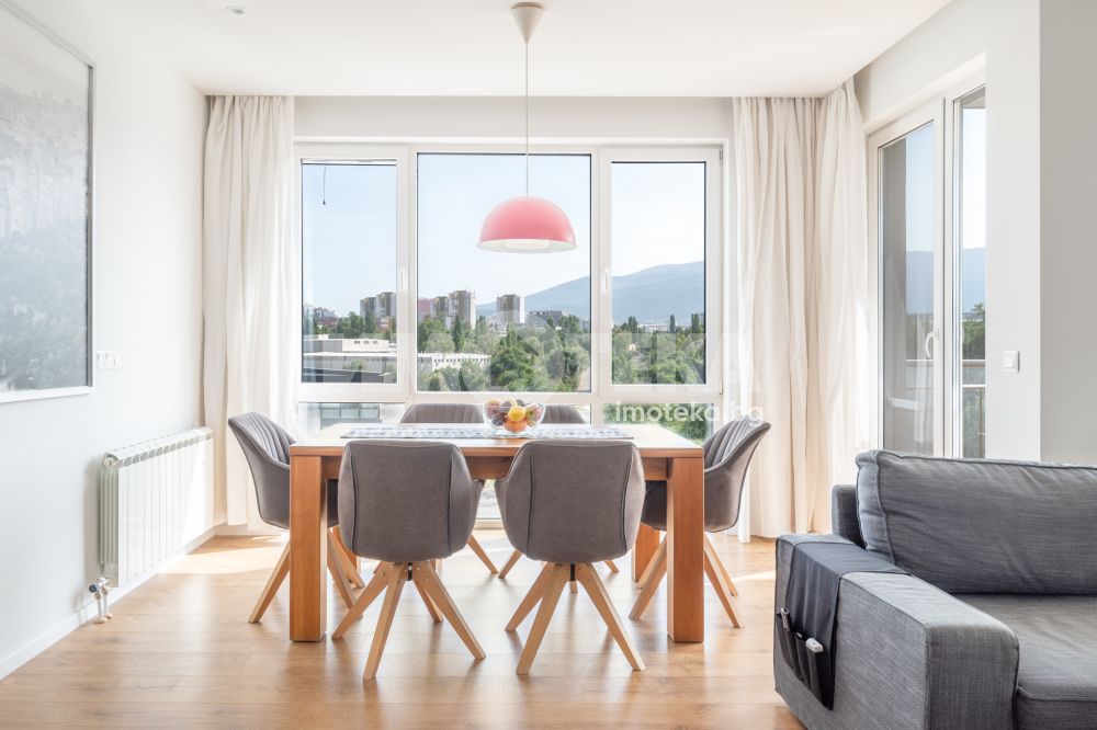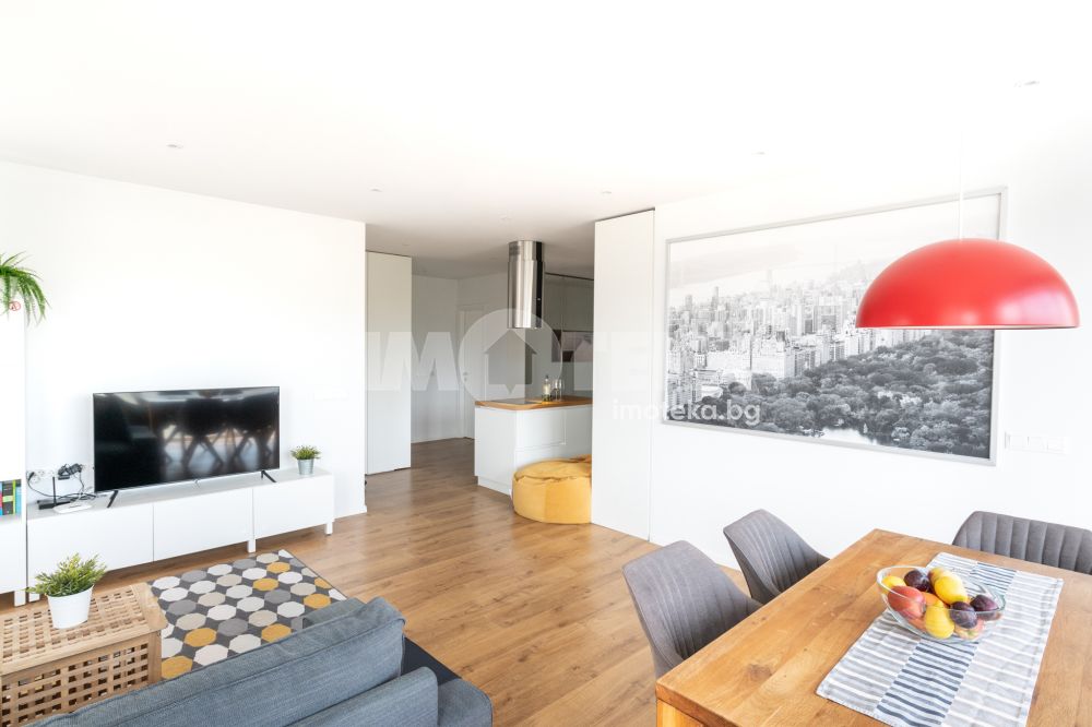 Апартаментът е 109 м2, хол с кухня, 2 спални, баня с тоалетно и отделно тоалетна с възможност за закупуване на 2 паркоместа в подземен гараж с достъп през асансьор, 2 мазета, апартаментът е изцяло обзаведен, южен, с панорамна гледка към Витоша, има и тераса, дограмите са с 3 стъкла + външни ролетни ел. щори в спалните + ролетни комарници. Отопление на ток (климатик Mitsubishi + конвектори Adax в спалните). Има възможност за закупуване на две подземни паркоместа на цена от 50 000 евро с опция за поставяне на гаражна врата.