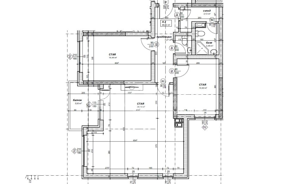 Тристаен апартамент със застроена площ 96,82 кв.м. Разпределение: предверие, дневна с кухненски бокс 34,14 кв.м, две спални 14,44 и 10,83 кв.м, тераса, баня с тоалетна, тоалетна и складово помещение. Възможност за закупуване на паркомясто на цена 22 000 евро.