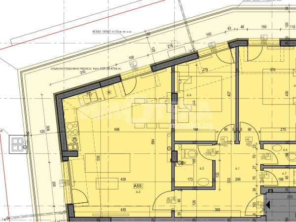 Апартамент с площ от 124,02 кв.м. и 80,40 кв.м застроена площ и ПАНОРАМНА ТЕРАСА ОТ 28,47 кв.м, общи части -15,15кв.м Разпределение: антре, дневна с кухня, две спални, баня с тоалетна, тоалетна, килер и ТЕРАСА 28,47 кв.м. Изложение: запад-северозапад.