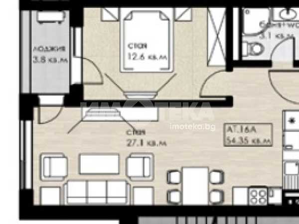 Двустайно ателие Ат.16А със застроена площ от 54.35 кв.м. Разположено е на втори етаж. Състои се от: дневна, спалня, баня с тоалетна и тераса. Изложението е северозападно. Височината под-таван е 2.75 метра.