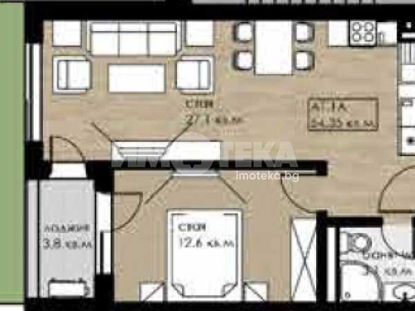 Двустайно ателие АТ.2А със застроена площ от 54.57 кв.м. Разположено е на първи етаж. Състои се от: дневна, спалня, баня с тоалетна и тераса. Изложението е североизточно. Височината под-таван е 2.70 метра. Без комисион.