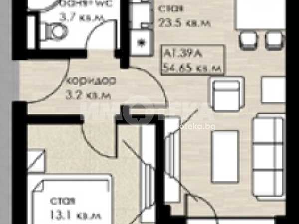 Двустайно ателие Ат.39А, ет.6, със застроена площ от 54.65 кв.м. Разположено е на четвърти етаж. Състои се от: дневна, спалня, баня с тоалетна и тераса. Изложението е северозападно. Височината под-таван е 2.70 метра. Без комисион.