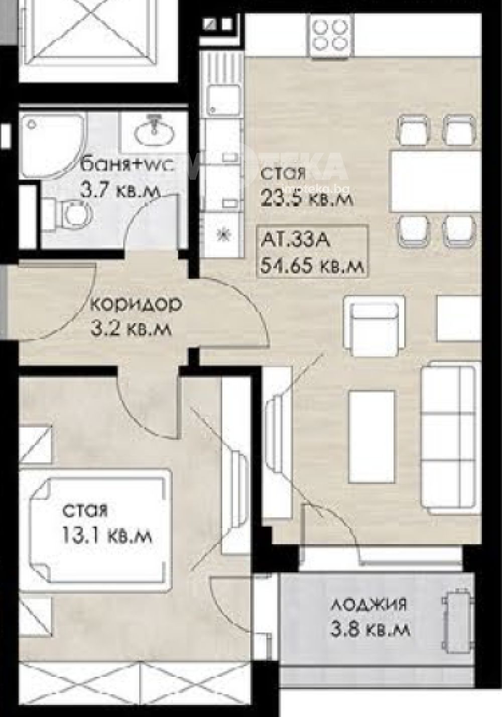 Двустайно ателие състоящо се от дневна с кухненски бокс, спалня, тераса, санитерен възел и антре.