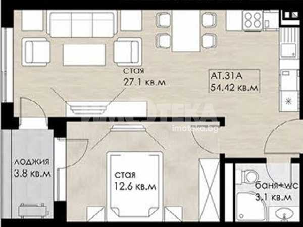 Двустайно ателие състоящо се от дневна с кухненски бокс, спалня, тераса и санитерен възел