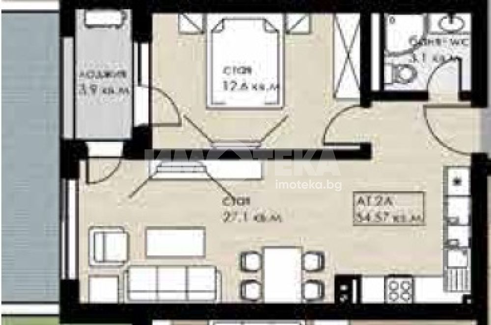Двустайно ателие АТ.2А със застроена площ от 54.57 кв.м. Разположено е на първи етаж. Състои се от: дневна, спалня, баня с тоалетна и тераса. Изложението е североизточно. Височината под-таван е 2.70 метра. Без комисион.