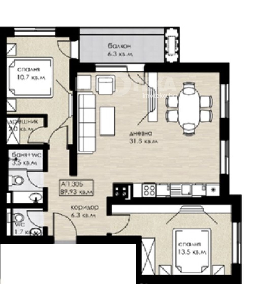 Тристаен апартамент Ап.30Б,със застроена площ от 89.93 кв.м. Разположен е на пети етаж. Състои се от: дневна, две спални, баня с тоалетна, отделна тоалетна и тераса. Изложенията са югозапад и югоизток. Височината под-таван е 2.70 метра.