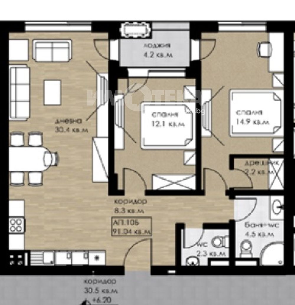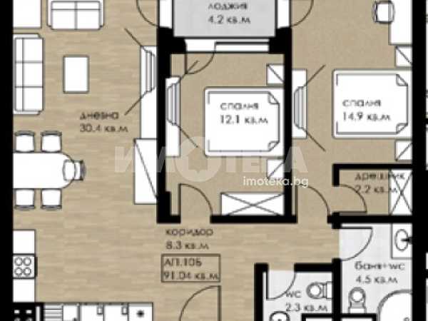 Тристаен апартамент Ап.10Б,, вх. Б, ет. 8, със застроена площ от 91.04 кв.м. Състои се от: дневна, две спални, баня с тоалетна, отделна тоалетна, тераса и дрешник. Изложението е югоизточно. Височината под-таван е 2.75 метра.
