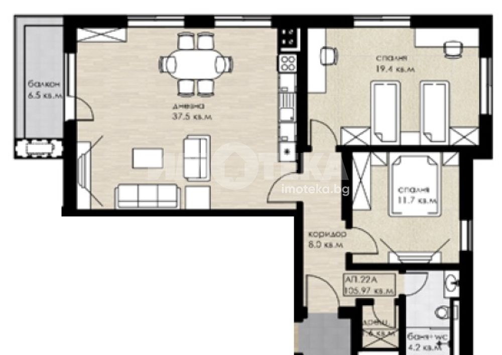 Тристаен апартамент Ап22А със застроена площ от 105.97 кв.м. Разположен е на трети етаж от седем. Състои се от: дневна, две спални, баня с тоалетна, отделна тоалетна и тераса. Изложенията са югозапад, югоизток и североизток. Височината под-таван е 2.75 метра.