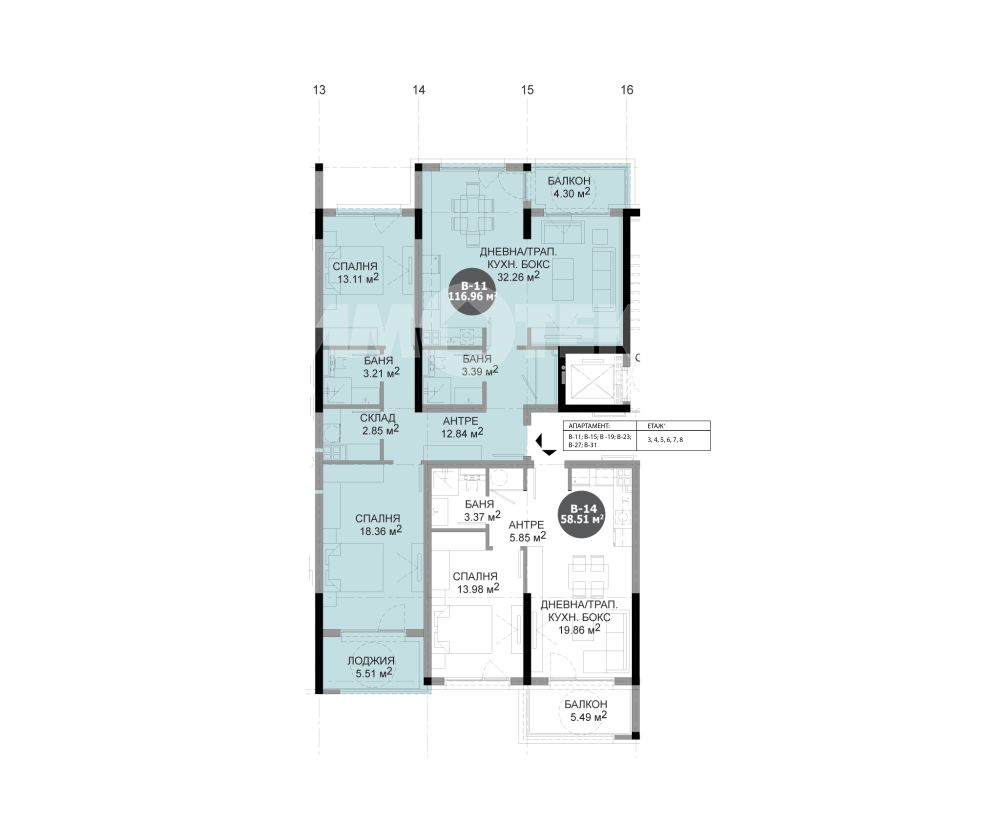 Двустайните апартаменти съдържат антре, баня, кухненски бокс, трапезария, дневна, спалня и балкон или лоджия. Тристайните апартаменти съдържат: антре, две бани, кухненски бокс, трапезария, дневна, две спални склад и/или мокро помощение и балкон или лоджия. Четиристайните апартаменти съдържат: антре, две бани, мокро помещение, кухненси бокс, трапезария, дневна, три спални и балкон или тераса. Към всяко жилище е предвиден склад в апартамента