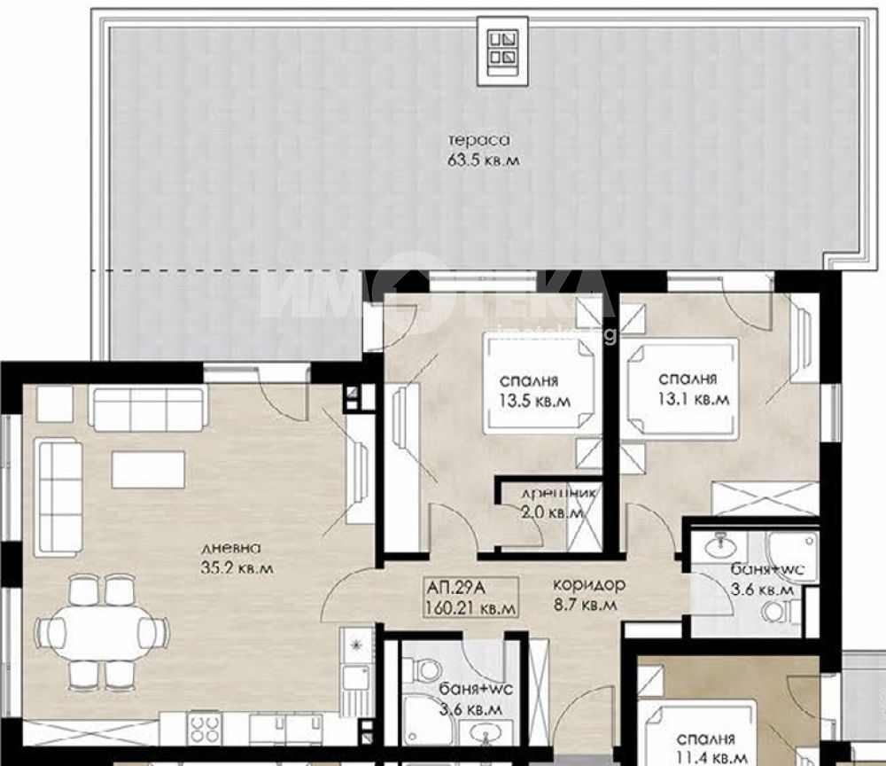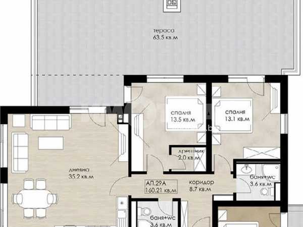 Тристаен апартамент състоящ се от дневна с кухненски бокс, 2 спални, тераса, 2 санитарни възела, антре, склад и голяма тераса