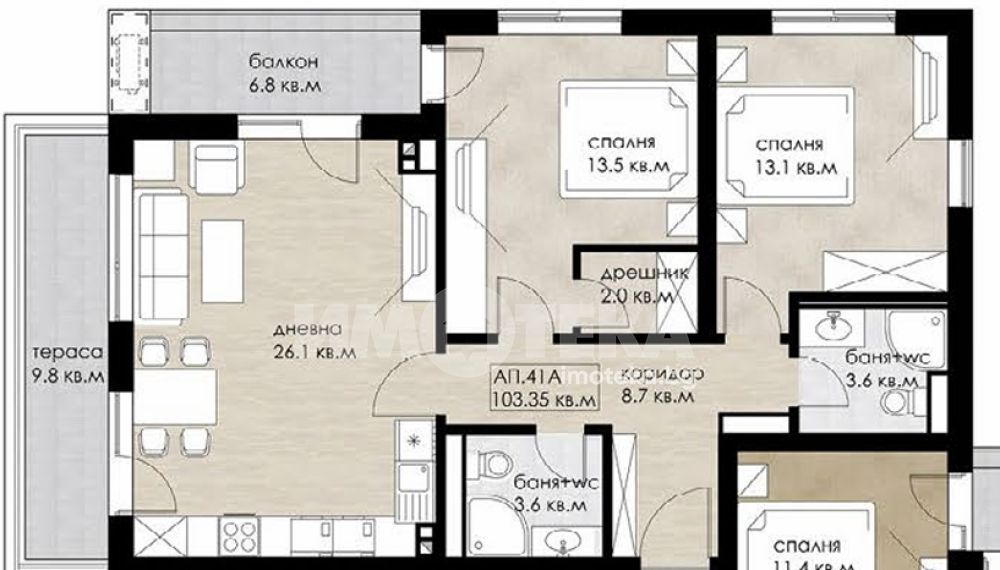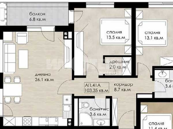 Тристаен апартамент състоящ се от дневна с кухненски бокс, 2 спални, 2 тераси, 2 санитарни възела, антре и дрешник