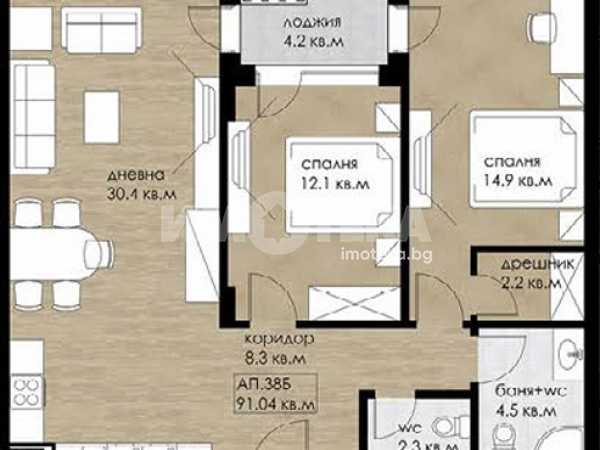Тристаен апартамент състоящ се от дневна с кухненски бокс, 2 спални, тераса, 2 санитарни възела, антре и дрешник