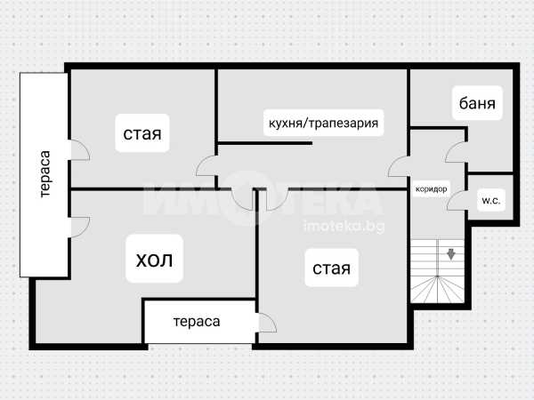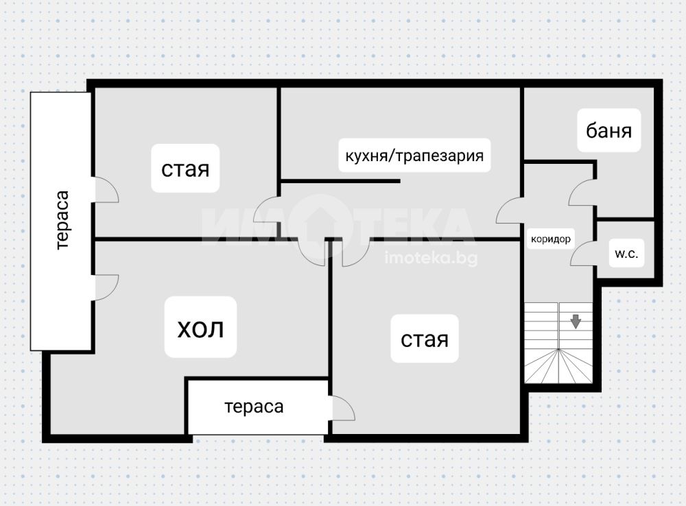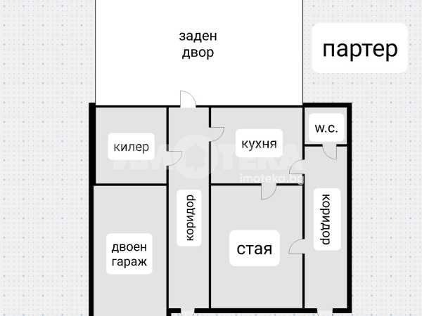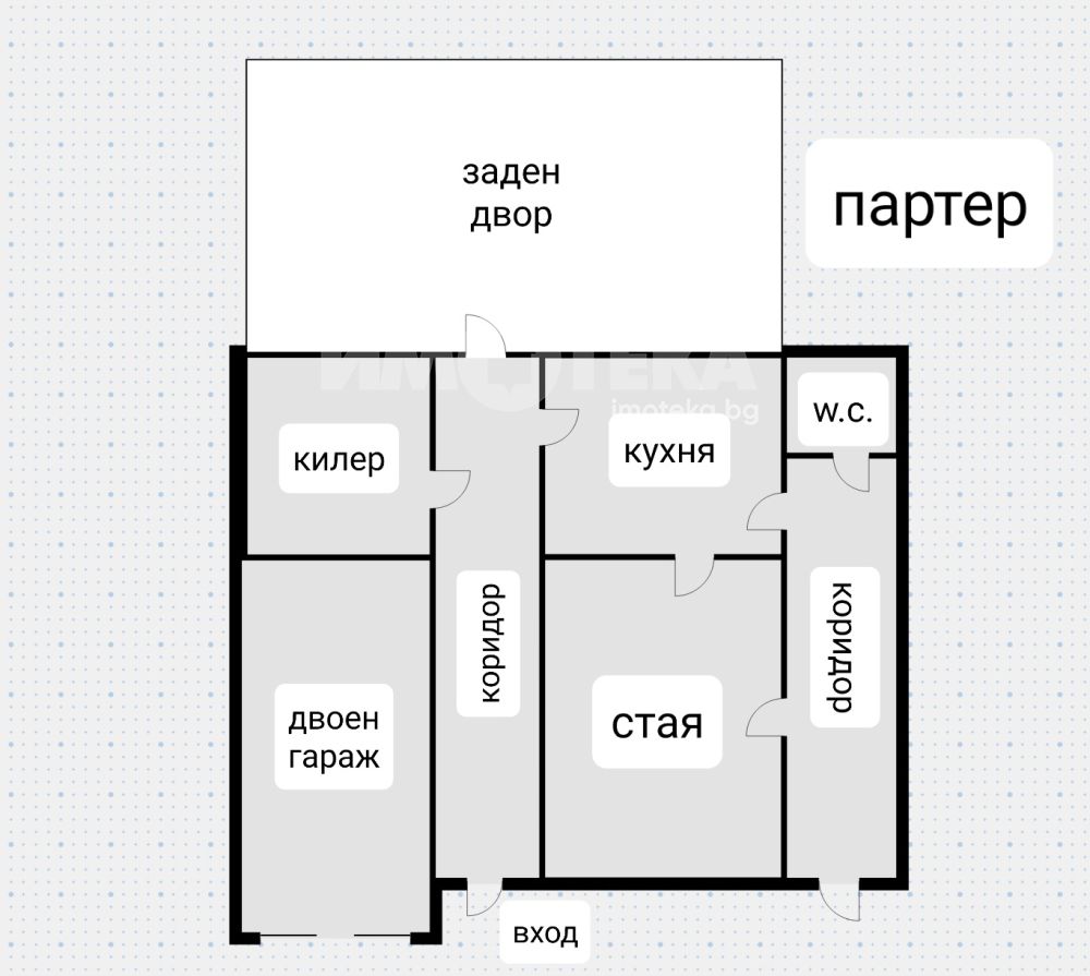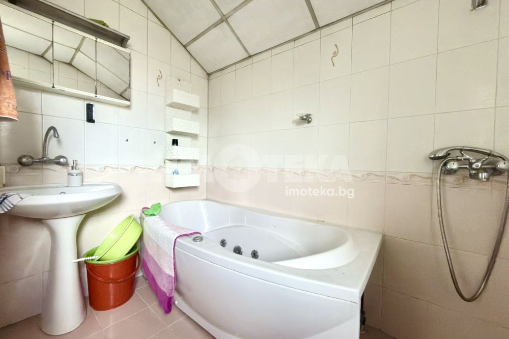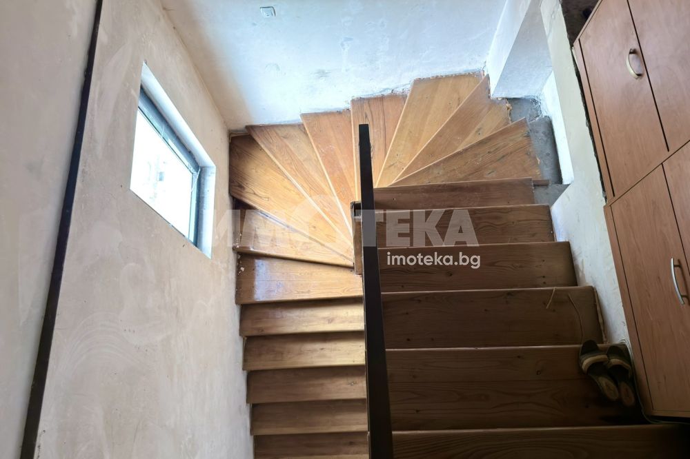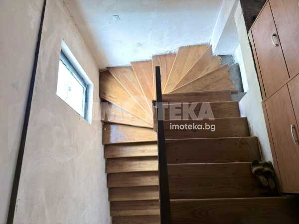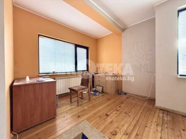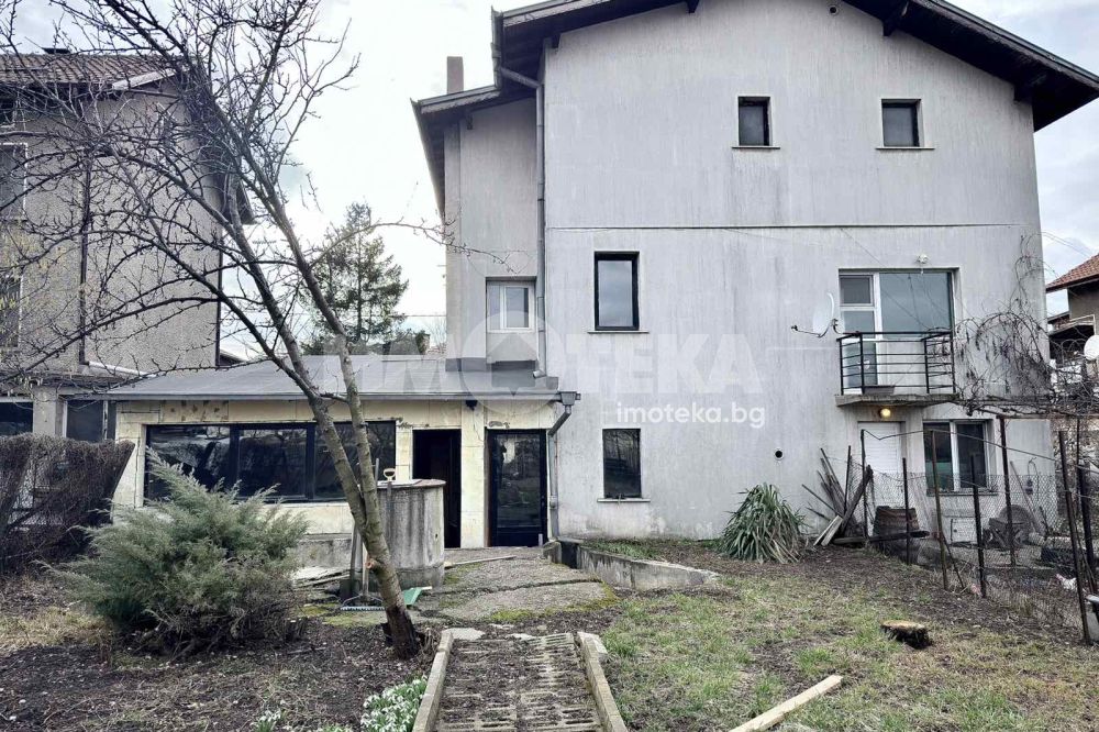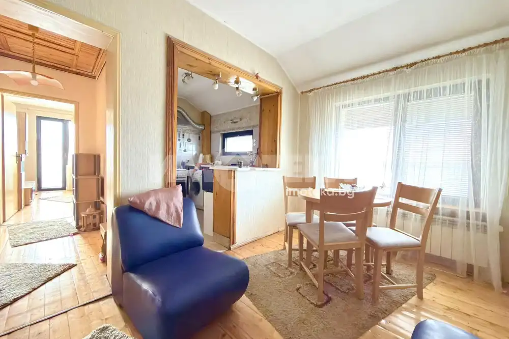 Къща близнак със самостоятелен двор . Имот на два етажа : Партерно ниво -гараж за две коли с работилница.Отделно има двустаен апартамент с две стаи и санитарен възел . На същото ниво - помещение, което е с директен излаз към вътрешния двор и би могло да се обособи като лятна кухня, сервизно помещение с котел на пелети и бойлер. На втори етаж е разположен един тристаен апартамент с куненски бокс и трапезария и три отделни стаи, баня с тоалетна и отделна тоалетна. Имота разполага със соларни панели за топла вода, два климатика. Продава се частично обзаведен. Централна канализация, кладенец в двора.