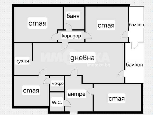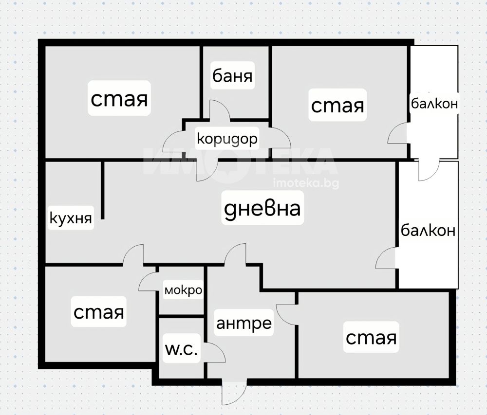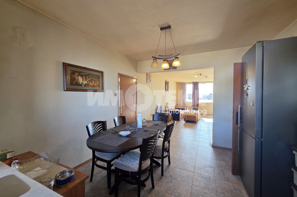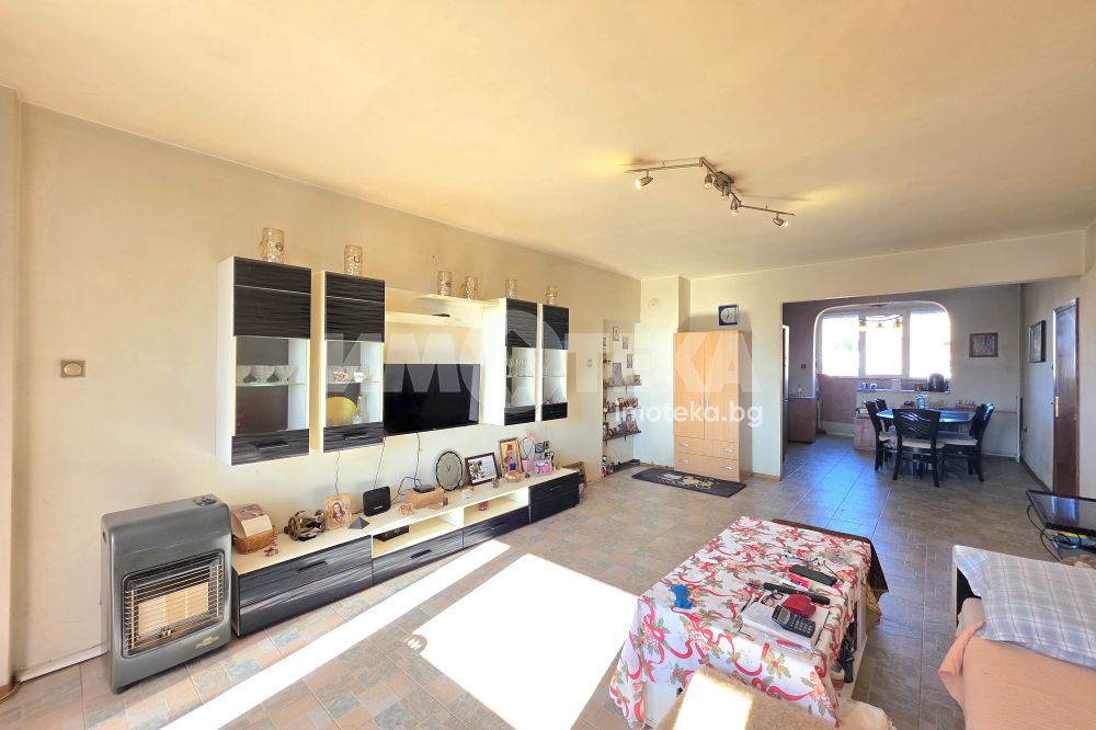 Многостаен апартамент състоящ се от антре, дневна с трапезария и кухненски бокс,четири спални, баня с тоалетна, тоалетна, три тераси.