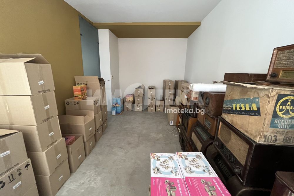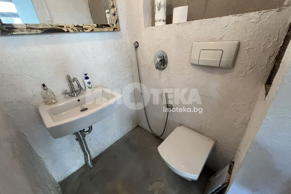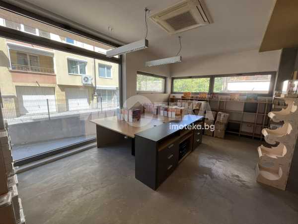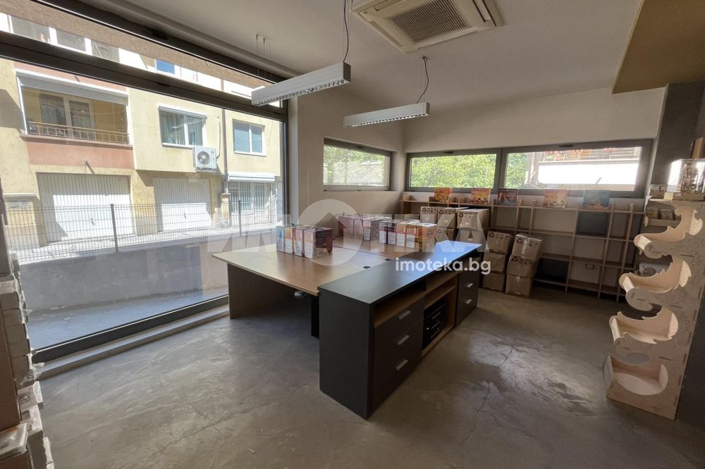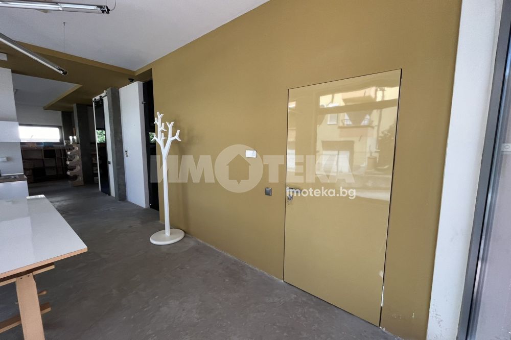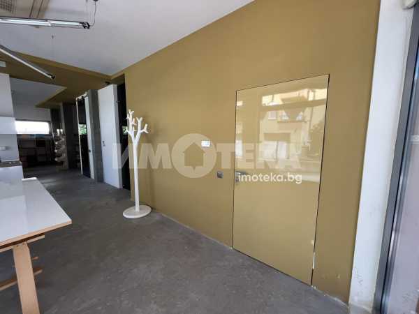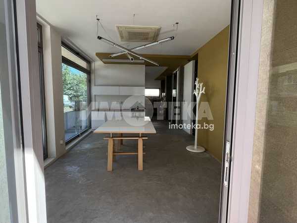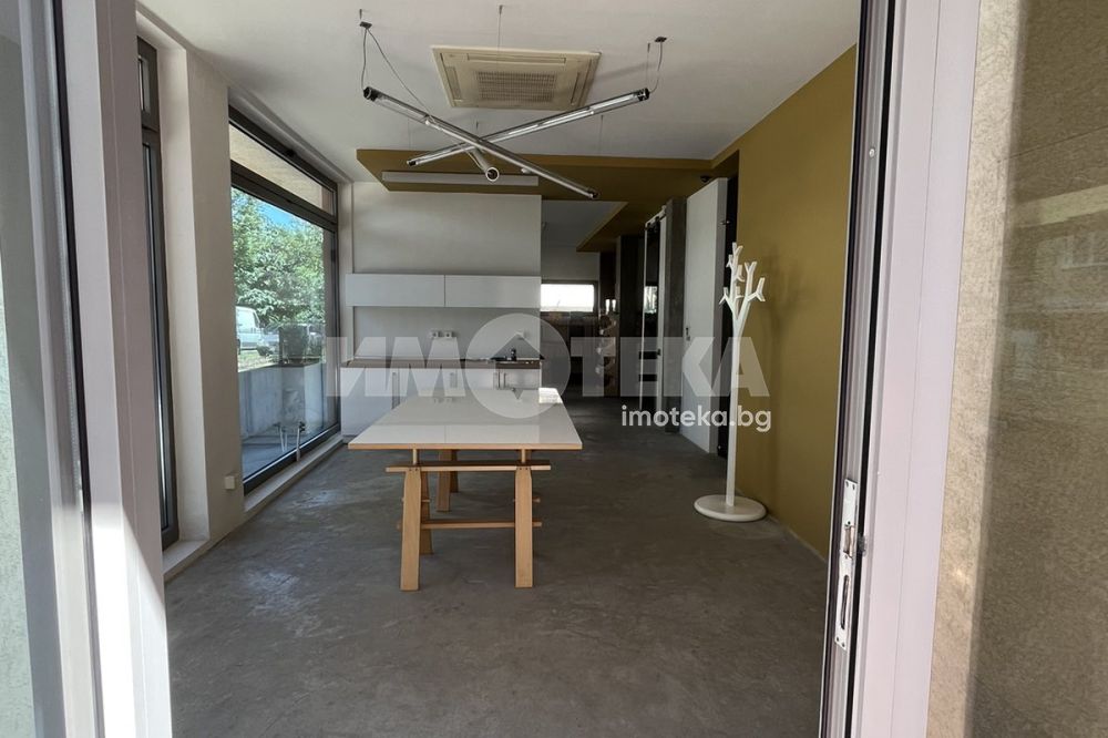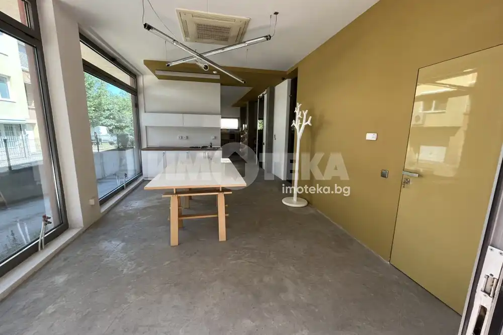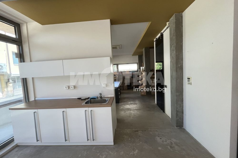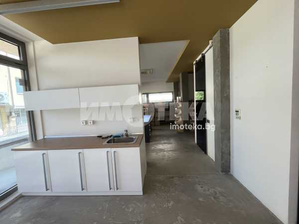 Офис завършен в индустриален стил с 95 кв.м. площ, без общи части. Състои се от голямо отворено пространство разделено от кухненски бокс, санитарен възел и отделено помещение за склад или кабинет.