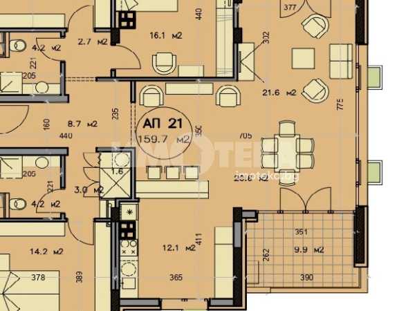 Просторен и функционален апартамент с отлично разпределение и много естествена светлина. Състои се от широка дневна с кухненски бокс и трапезария, с излаз към голяма тераса, подходяща за отдих и озеленяване.