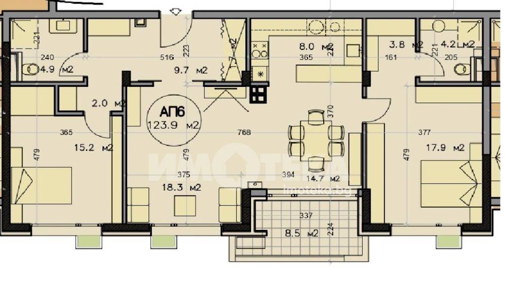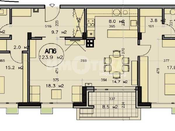 Функционален и светъл апартамент с добре организирано разпределение. Състои се от просторна дневна с кухненски бокс и трапезария, с излаз към тераса, две самостоятелни спални, две бани с тоалетна, както и удобно входно антре с място за съхранение.