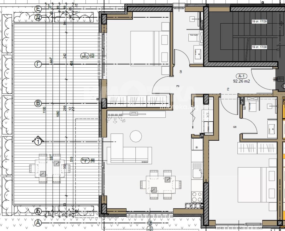Проектът се отличава с високо качество на строителството и модерна окачена фасада, която придава уникален и стилен вид на сградата.