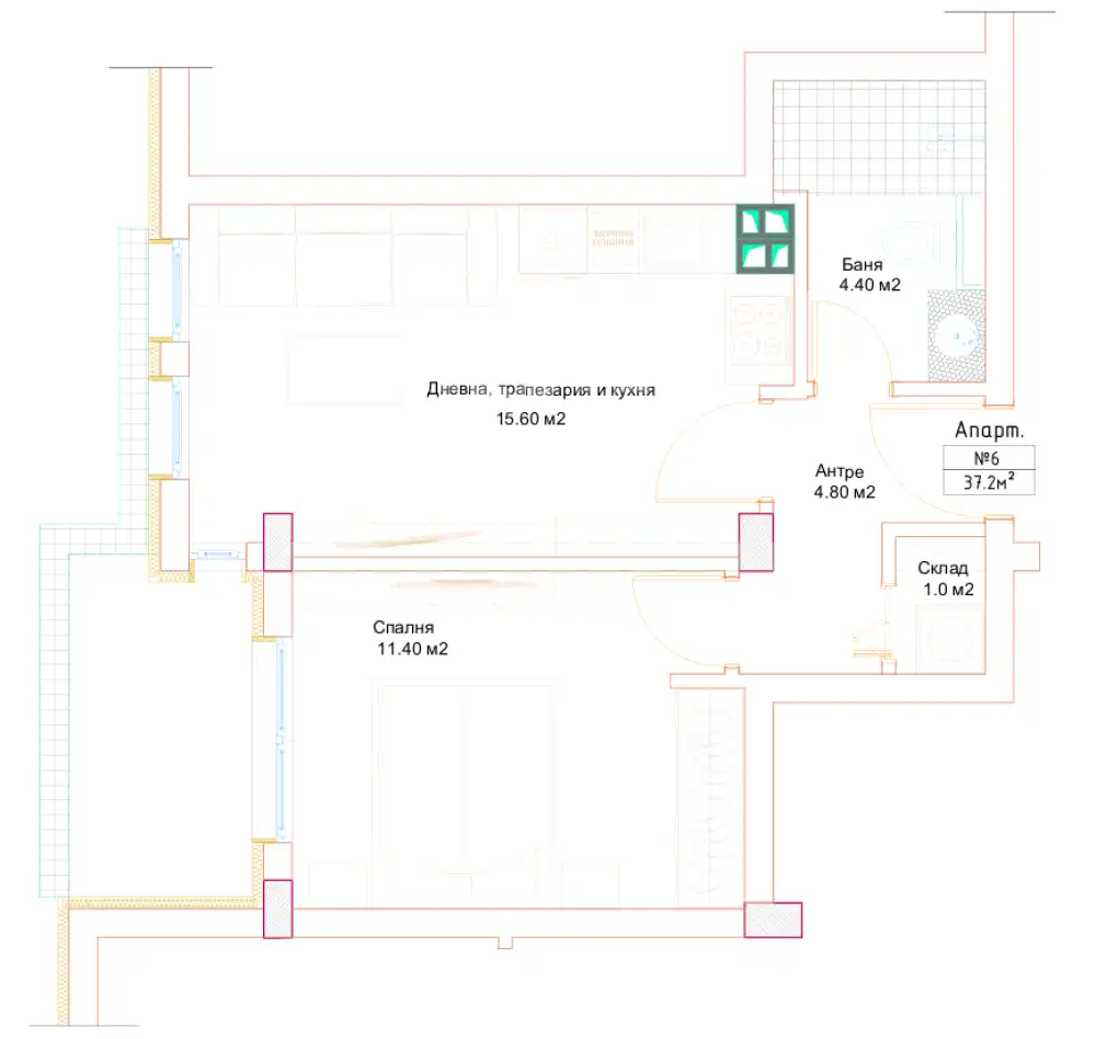 Жилищната площ е 48.37 кв.м, а общите части са едва 5.63 кв.м.
