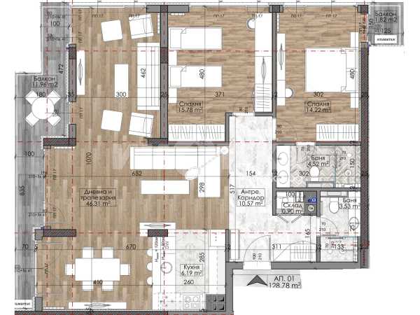 Функционален тристаен апартамент със застроена площ от 129 кв.м. Състои се от: дневна с трапезария и кухненска част от 53 кв.м., две спални по 16 кв.м. и 14 кв.м., две бани, коридор и две тераси. Изложението е изток-запад.