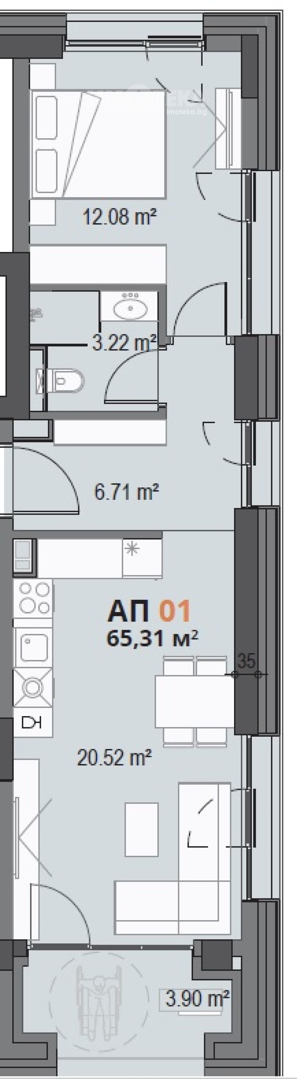 Двустаен апартамент, състоящ се от дневна с кухненси бокс, спалня , баня с тоалетна и тераса. ЗП 65кв.м.