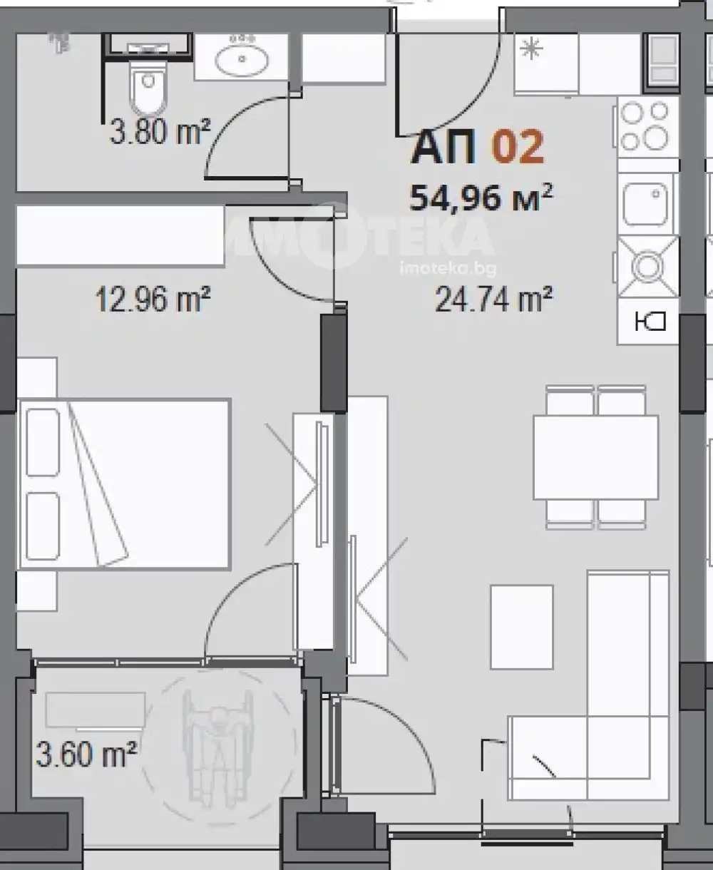 Двустаен апартамент, състоящ се от дневна с кухненси бокс, спалня , баня с тоалетна и тераса.