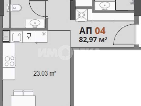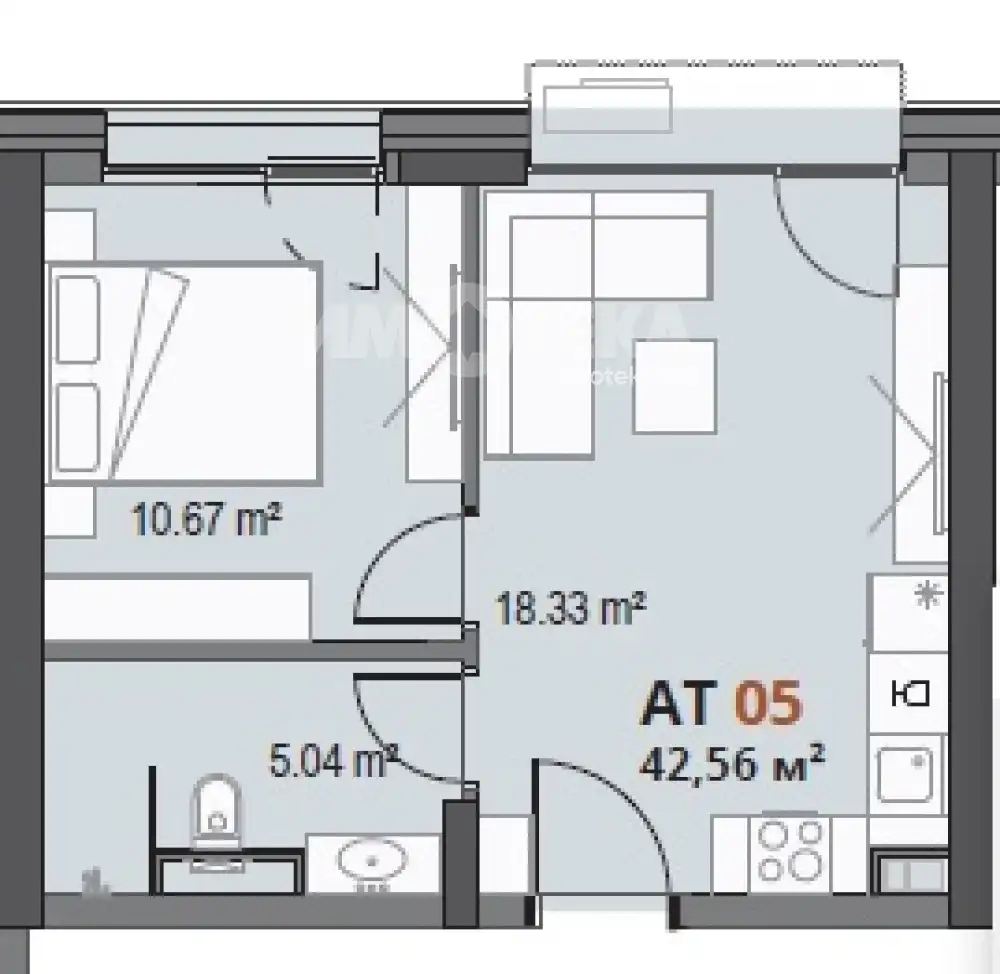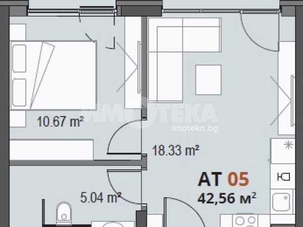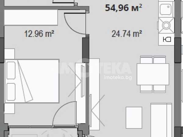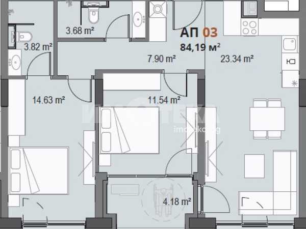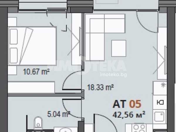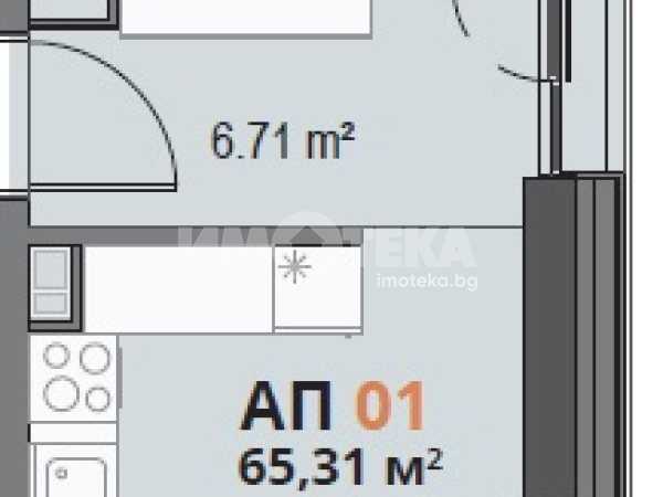 Двустаен апартамент- статут на ателие, състоящ се от дневна с кухненси бокс, спалня и баня с тоалетна.