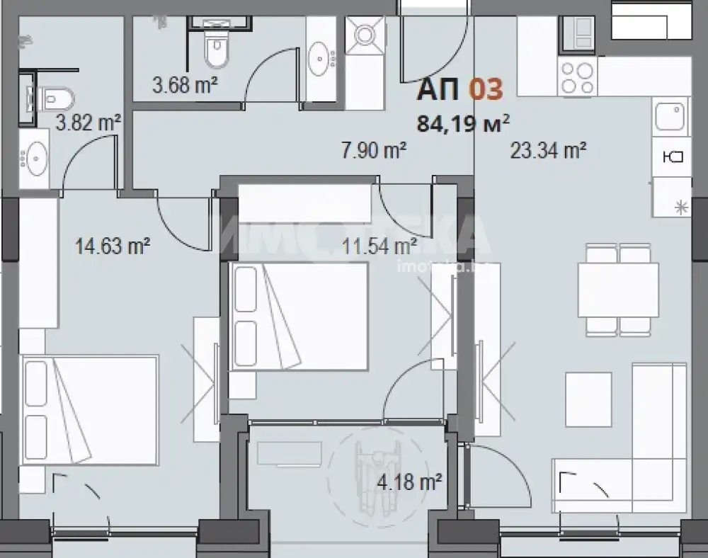 Тристаен апартамент, състоящ се от дневна с кухненси бокс, две спални , баня с тоалетна, втора баня с тоалетна и тераса.